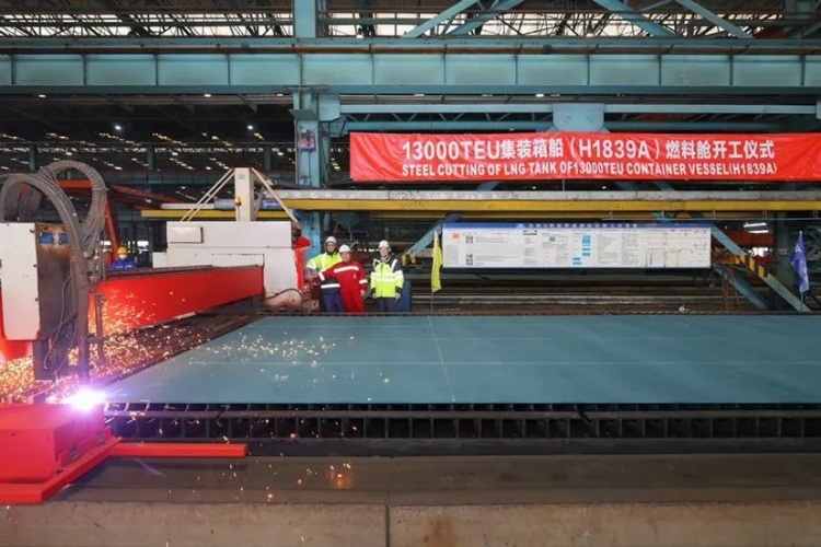 当天上午,沪东中华为加拿大Seaspan公司建造的3艘15500TEU大型常规动力集装箱船系列首制船开工。同时,为法国达飞海运集团建造的6艘13000TEU大型双燃料动力集装箱船系列项目的液化天然气(LNG)燃料舱开建,标志着该项目正式启动。这是该公司建造的2型最新款大型箱船,为中国制造双燃料和常规动力箱船“家族”喜添新丁,将再一次奠定沪东中华在全球大型箱船建造领域的领先地位。