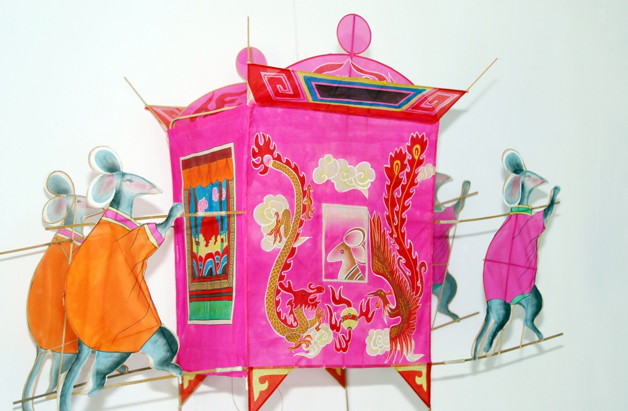 “王家庄子村的风筝主要有三种基本造型:串式、硬翅式和简形式。其中串式以龙头蜈蚣为代表,据说是受了龙骨水车的启发而制作的。现在已经发展成许多品种,小的可置于掌上,大的有几百米长。”坊子区风筝产业协会秘书长王铁源介绍。