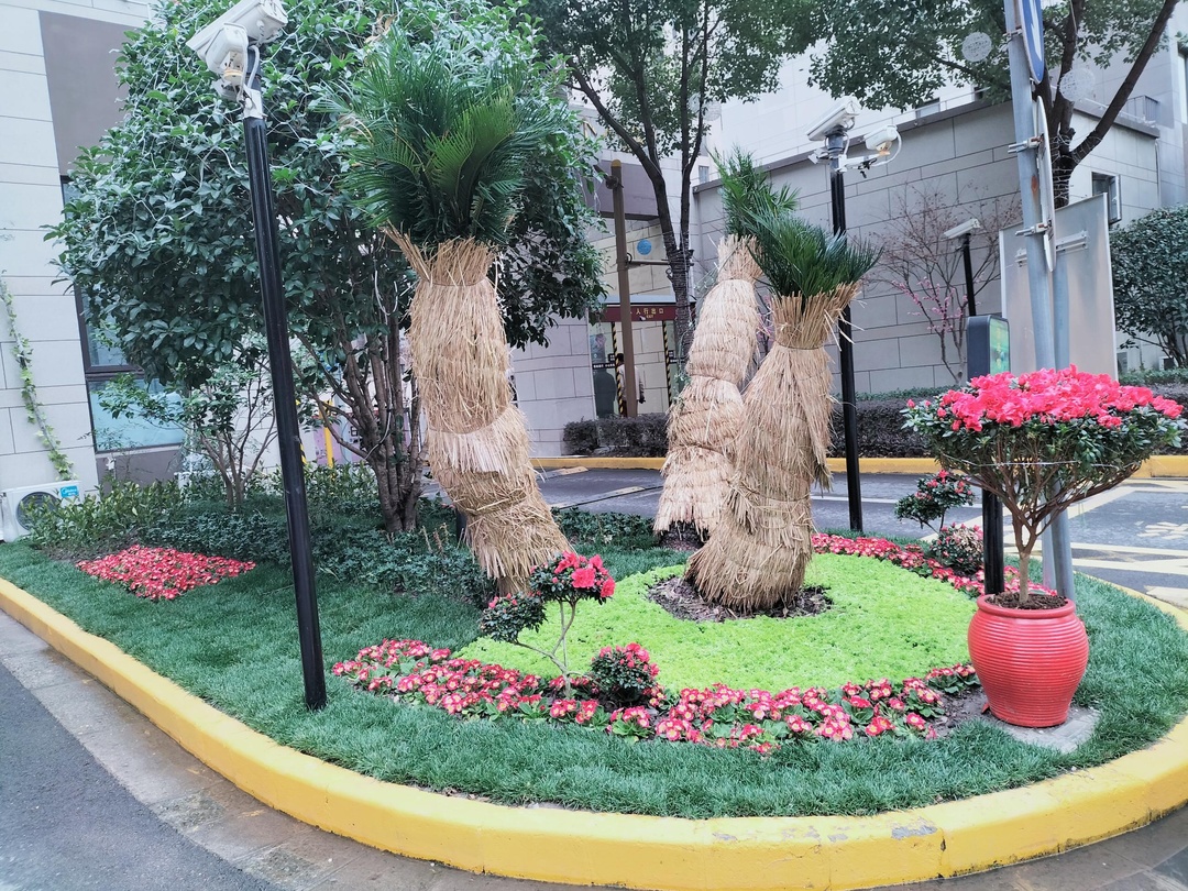 经专业绿化公司设计,保留高大的棕榈树,增加开花类和色叶类植物,丰富植物品种和四季颜色变化,同时增加灯光效果。