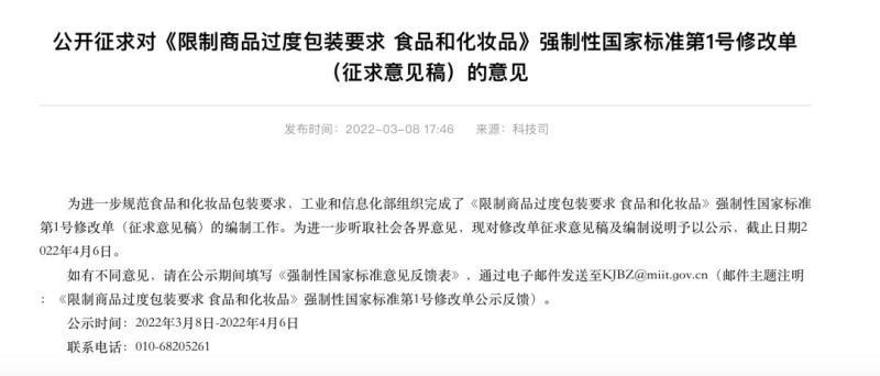 3月9日,记者从工信部网站获悉,为进一步规范食品和化妆品包装要求,工业和信息化部组织完成《限制商品过度包装要求食品和化妆品》强制性国家标准第1号修改单(征求意见稿)(以下简称《征求意见稿》)的编制工作,对月饼和粽子的包装层数、包装成本、混装要求、商品必要空间系数k值等进行了修改,从3月8日起向社会公开征求意见。