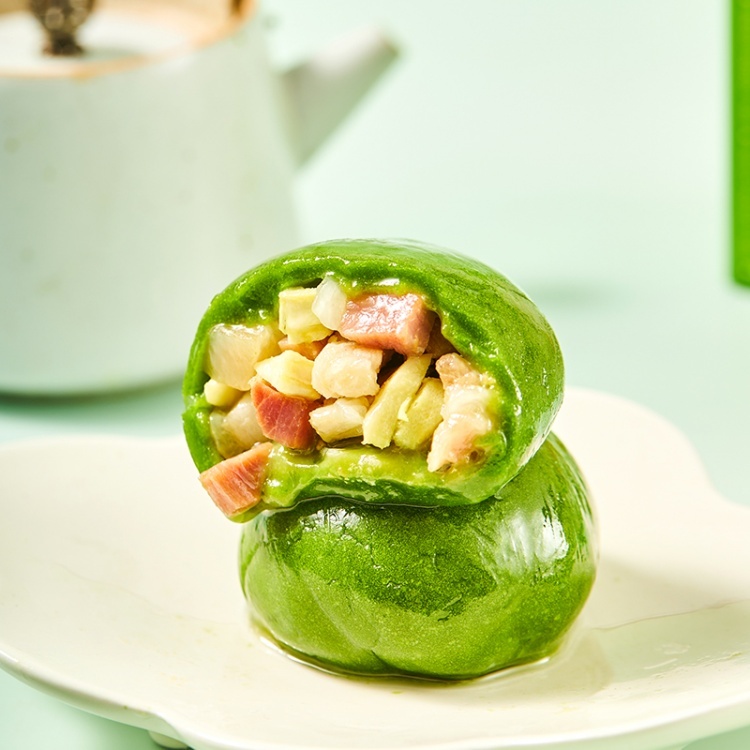 咸口的有腌笃鲜青团,腌笃鲜是上海人春季不可错过的美味,选用了上海百年老字号“邵万生”咸鲜唯美的优质咸肉,和当季鲜嫩可口的新鲜冬笋肉。