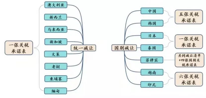 即在大部分产品采取“统一减让”的基础上,小部分产品对不同国家适用不同的降税安排。这意味着同一税号下的原产于不同缔约方的货物,在进口时可能适用不同的RCEP协定税率。