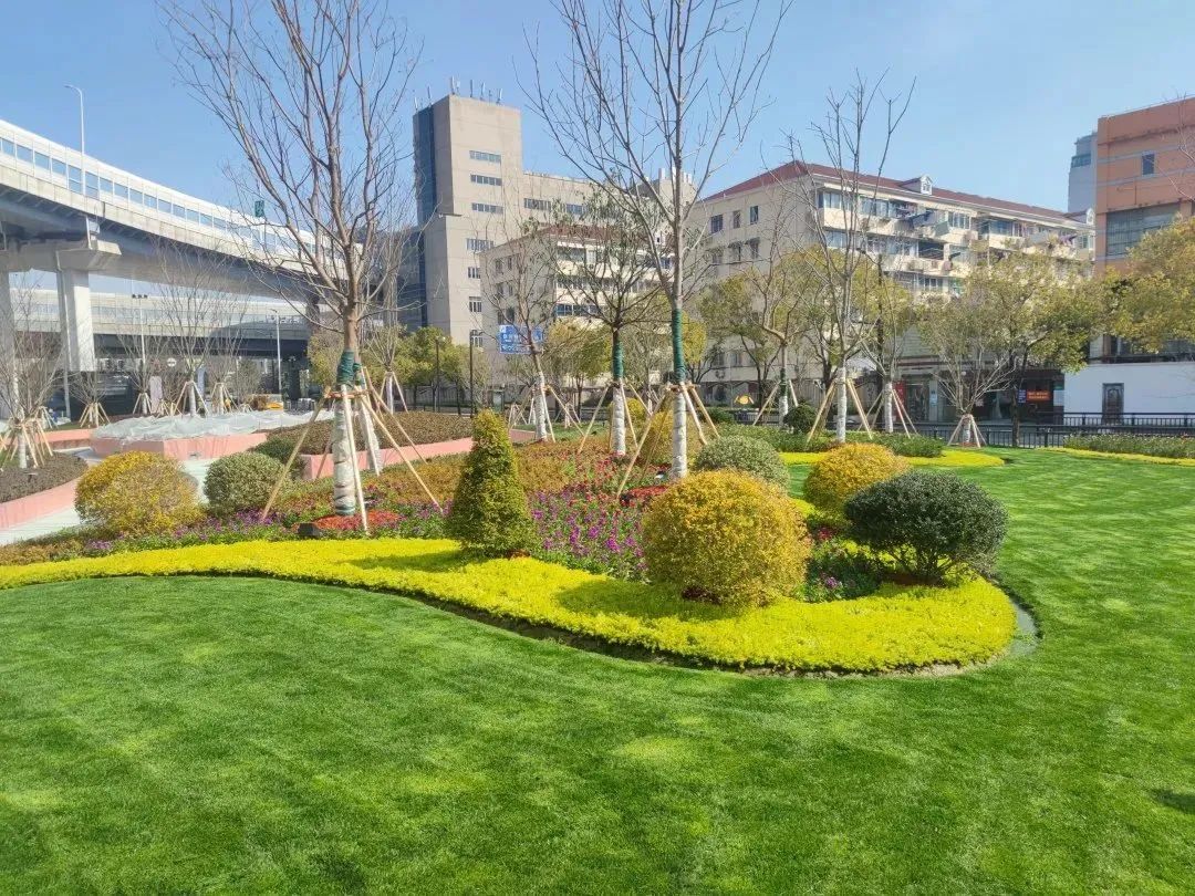 街心花园中央设置了三处叶片型花坛,分别种植着西洋杜鹃、茶梅以及墨西哥鼠尾草等花卉品种,花坛的局部视觉聚焦处点缀了花境,还种植了日本早樱、乌桕、无患子等色叶乔木。五色斑斓的花卉植物,为街心花园营造出一片春有花可赏、秋有色可观的盎然景致。
