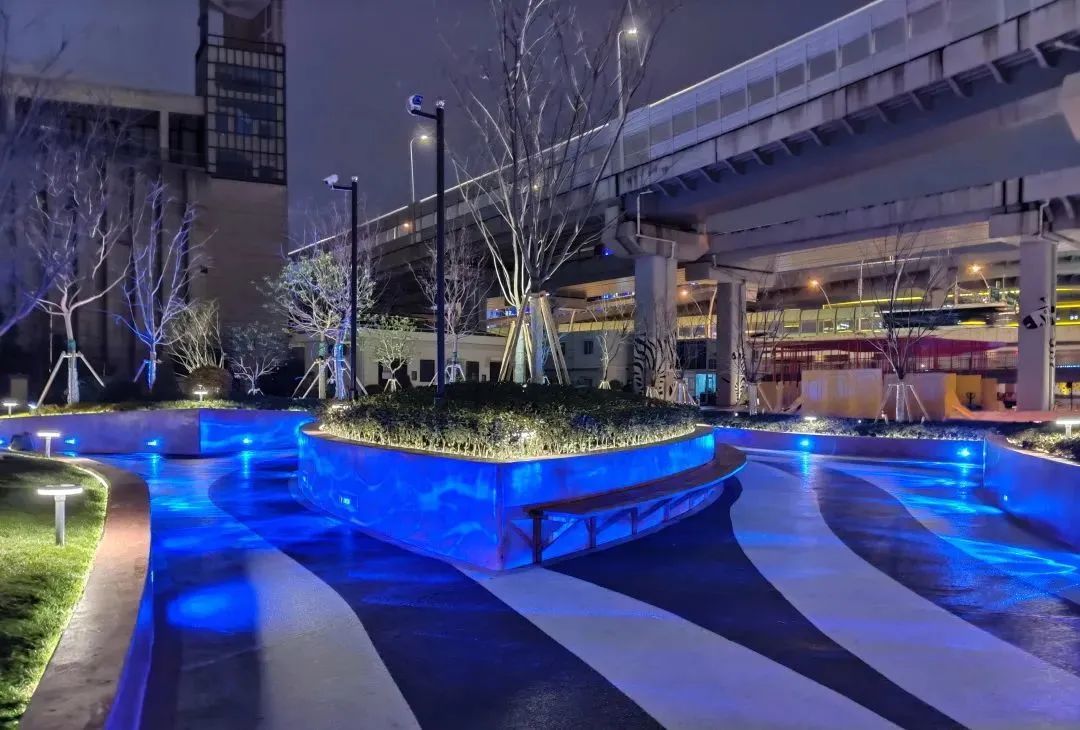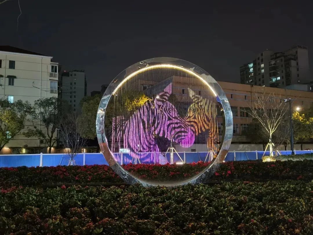 值得一提的是,叶片型花坛的中央设有投影水帘和雾森装置,灯光与水雾结合,呈现出的“斑马”形象,让夜晚的花园仙气十足,充满了动态美。
