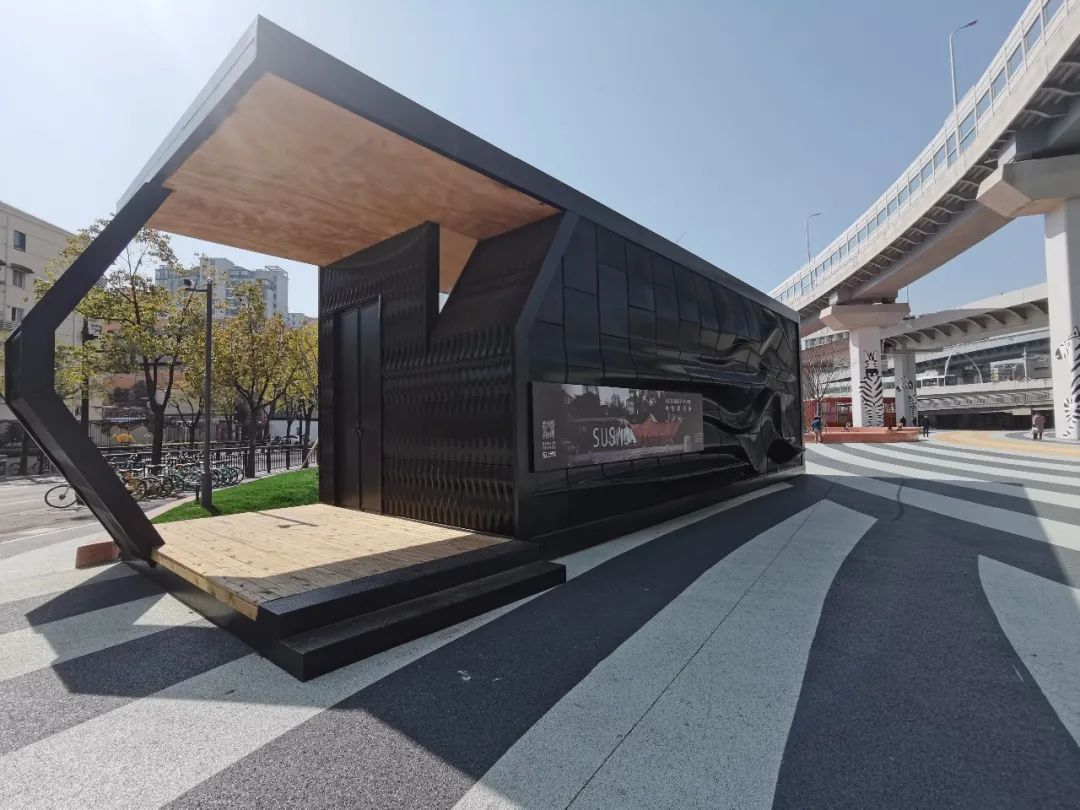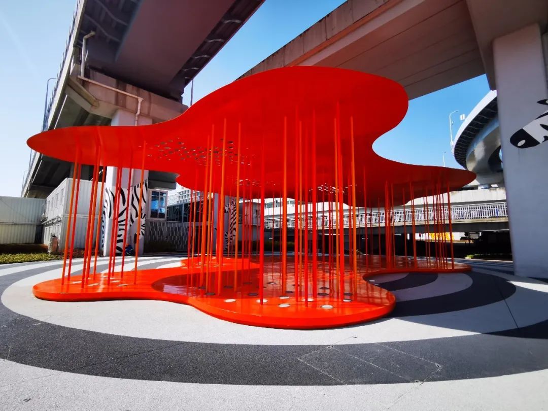 此外,街心花园也处处充满了艺术的气息,公园最里面有一处红色的艺术装置,名为《漂浮的廊亭》,动态的线条和醒目的颜色给公园增色不少。公园入口处还有一个名为“融”的黑色盒子,这个作品是运用数字木构与机器人3D打印工艺,通过流动的曲面形式变化,建构出的一个沉浸式展陈空间。“融”是去年城市空间艺术季的作品,未来,这个小小的空间将作为居民区共享空间使用。