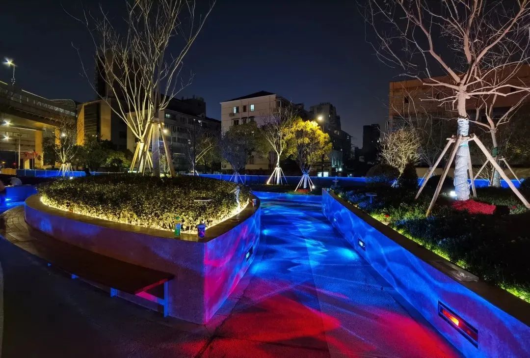 夜晚,街心花园的灯光柔和舒适,高区乔木照明、中区草坪及地被边缘照明和低区步道照明,三个空间,层次分明。