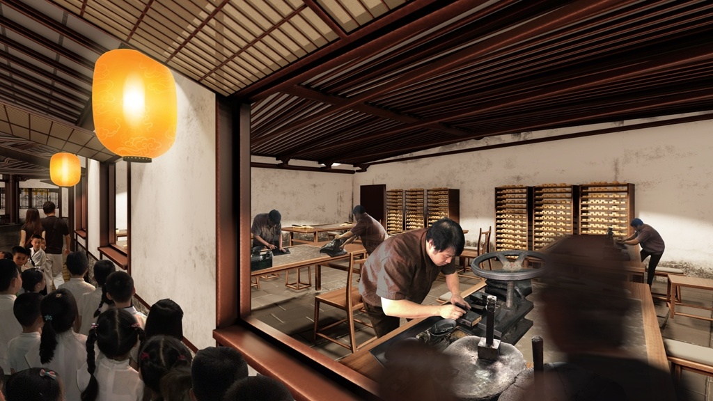 未来,在笔墨宫坊内,将有“曹素功制墨”和“周虎臣制笔”两项国家级非遗技艺的生产展示,可以了解“点烟”“制墨”“翻晾”“制笔”等生产环节,沉浸式体验制墨、描金、拓片这些步骤……市民还能制作一锭专属墨锭,在此近距离感受非遗传承人的独特手艺。