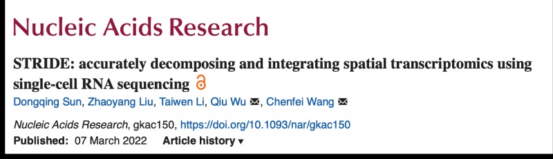 3月7日,同济大学附属同济医院王晨飞课题组在Nucleic Acids Research杂志上发表文章STRIDE: accurately decomposing and integrating spatial transcriptomics using single-cell RNA sequencing,开发了空间转录组与单细胞整合分析工具STRIDE,通过机器学习方法及数据整合,将空间转录组学数据提升至单细胞精度。