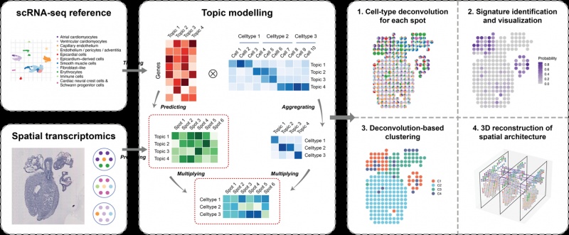 STRIDE(Spatial transcriptomics deconvolution by topic modeling)基于主题模型这一机器学习算法,旨在借助匹配的单细胞数据对空间转录组进行细胞类型的解析。STRIDE首先从单细胞数据中学习训练出细胞类型相关的主题模型,接着将该主题模型应用于空间转录组数据中,以获得每一个空间位置上的主题分布,从而推测其精确的细胞组成。此外,STRIDE还提拱了包括空间特征识别及可视化、空间聚类以及三维组织重建在内的下游分析功能。