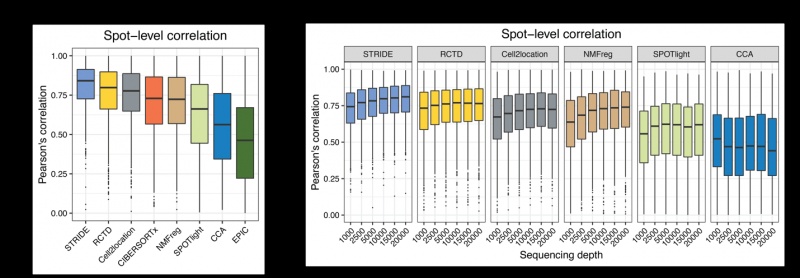 为了论证STRIDE在解析细胞组成比例上的准确性,文章从乳腺癌单细胞数据中模拟产生了空间转录组数据,并对其进行细胞组成的预测,与其他已经发表的空间转录组反卷积分析工具相比,STRIDE有着更高的准确性与灵敏度,且在解析空间上有共定位关系的细胞组成以及测序深度较低时具有更好的表现。