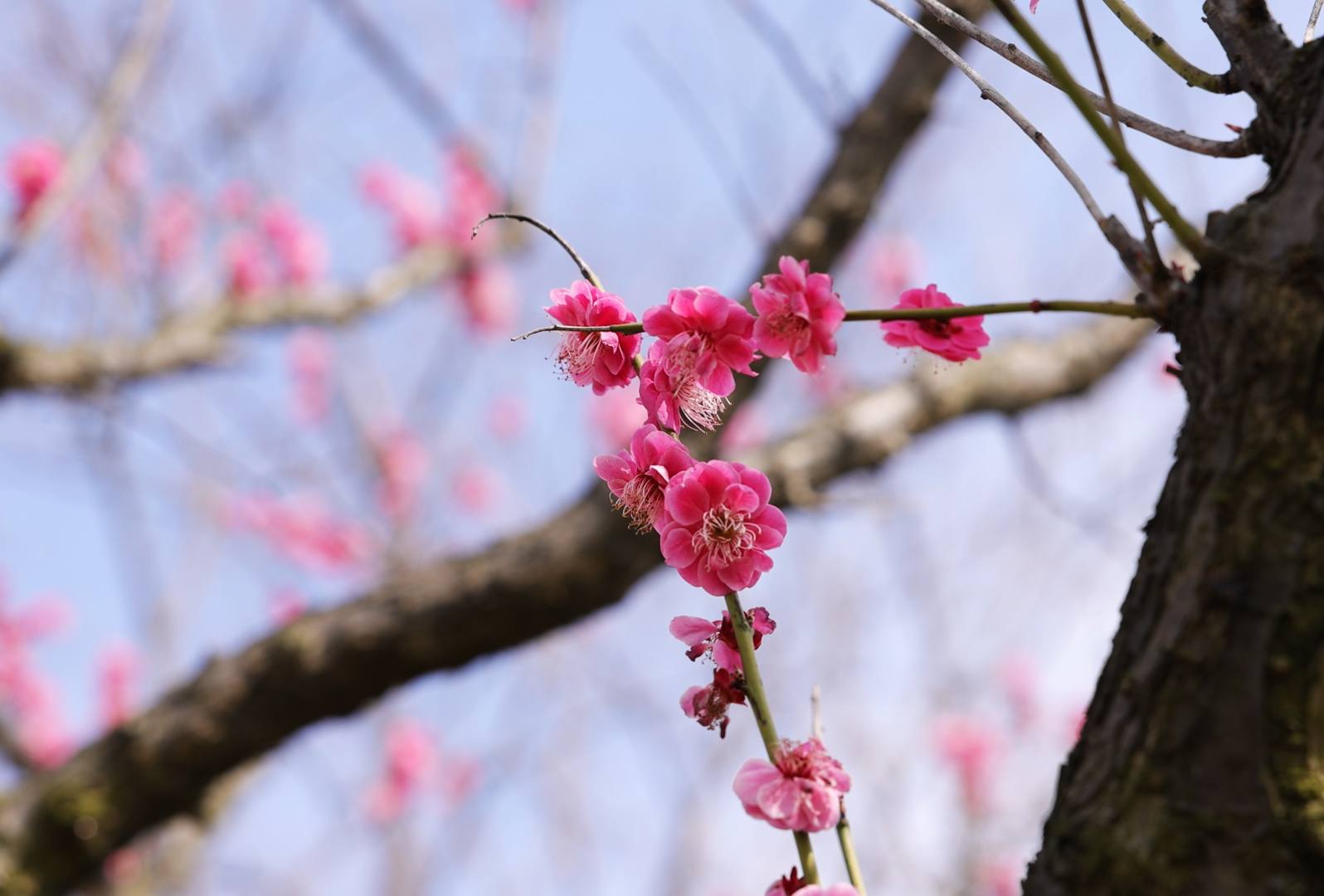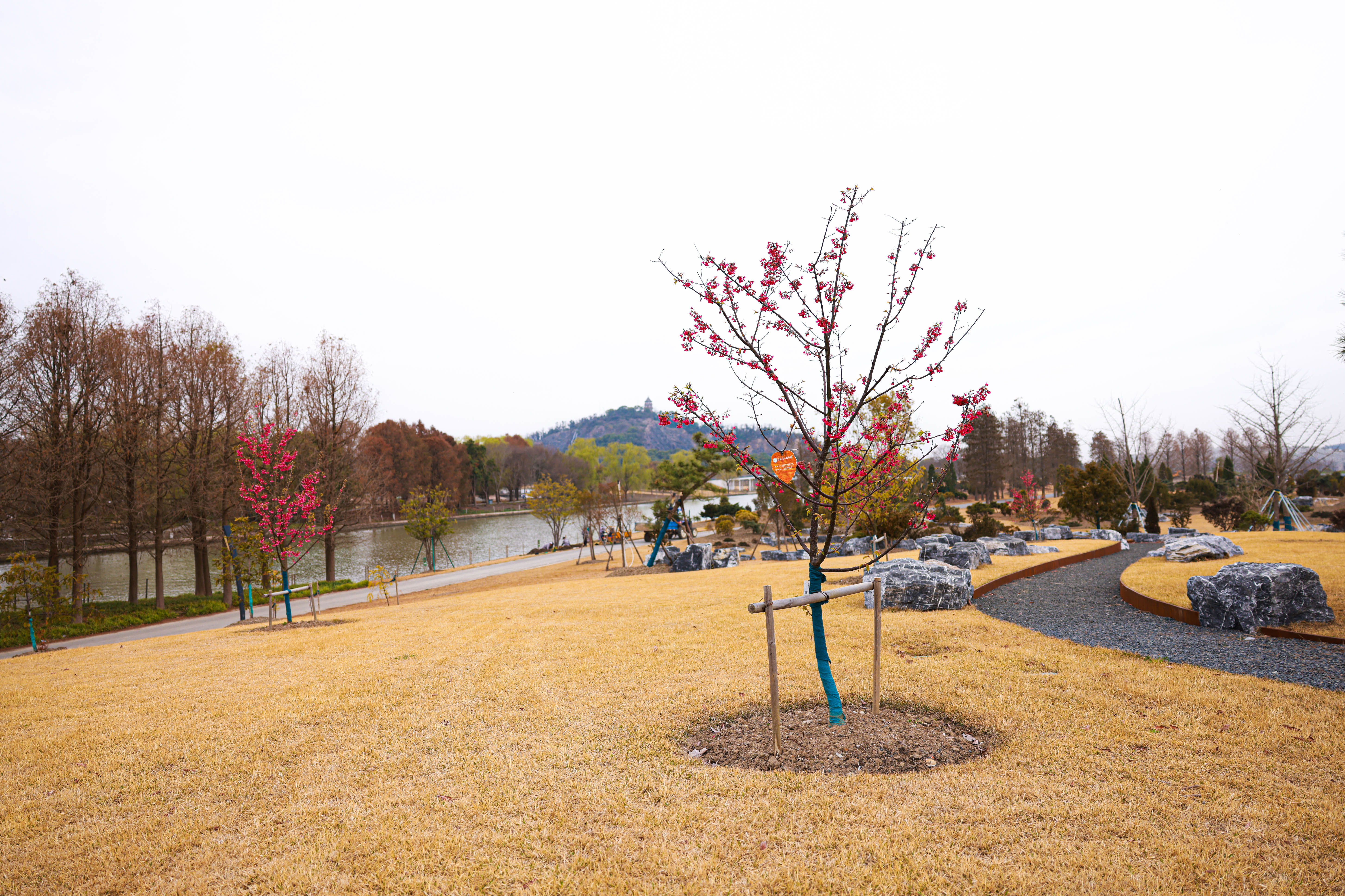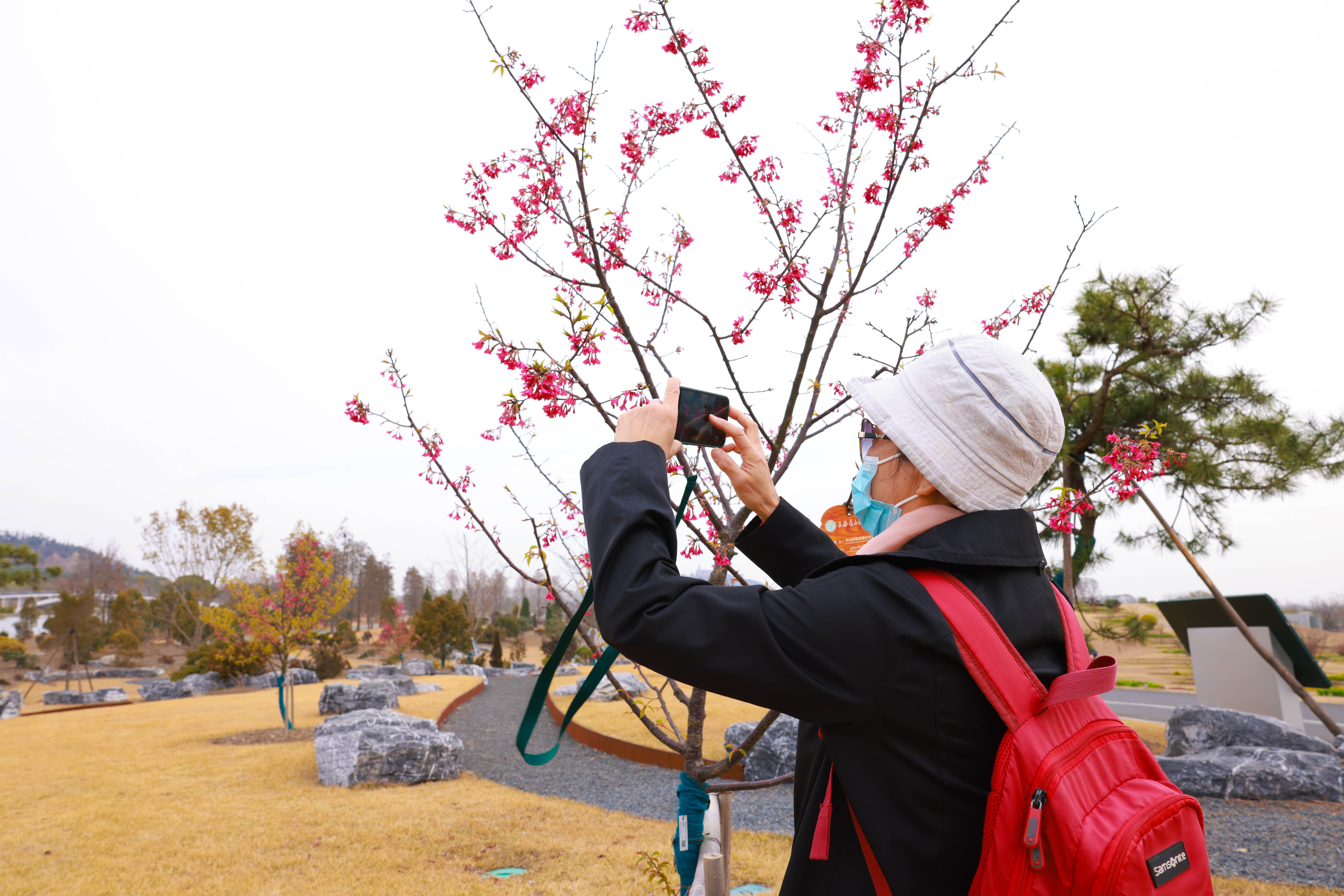 在与广富林郊野公园一路之隔的上海辰山植物园也有着一段动人故事。2020年疫情期间,一张上海援鄂医疗队队员在夕阳下推着病床上老人的照片感动了无数人,把两座城市紧密连接在了一起,为此,去年3月,辰山植物园和武汉植物园共同举办了一场双城“樱”乐会。在这场“樱”乐会中,首批上海援鄂医疗队队员在辰山植物园华东区系园的湖畔种下一株钟花樱树苗,寓意着用自己的努力绽放为人们带去希望。记者看到,钟花樱如今已绽放出一簇簇玫粉色的花朵,伴着和煦的春风轻轻晃动,在远处辰山和湖水的映衬下,显得格外靓丽,引得游人纷纷驻足拍照。上海辰山植物园高级工程师刘炤告诉记者,因为是新种植的树苗,所以钟花樱的养护得选择温养,慢慢地使其根系自然生长,现在这株钟花樱长势良好。刘炤介绍,园内钟花樱与河津樱目前都已进入盛花期,花期预计持续到本周末。