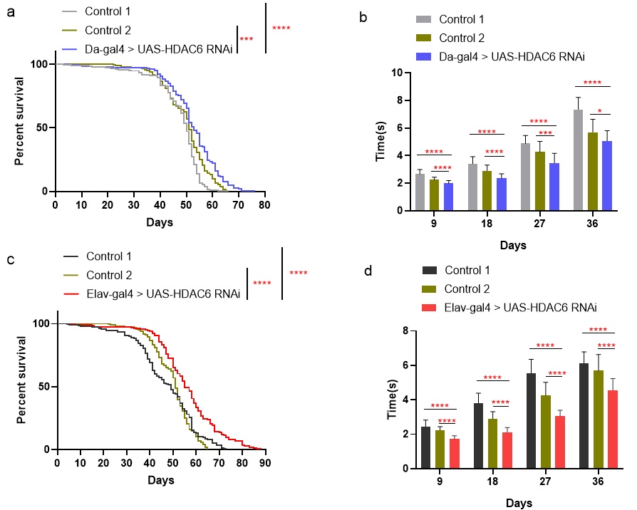 为了探究在果蝇中敲低HDAC6对果蝇运动能力和寿命是否产生影响,研究者们用全身性表达的Da-gal4在果蝇体内全身性敲低HDAC6。他们发现,敲低HDAC6确实可以延长果蝇的生存时间(图2a)。