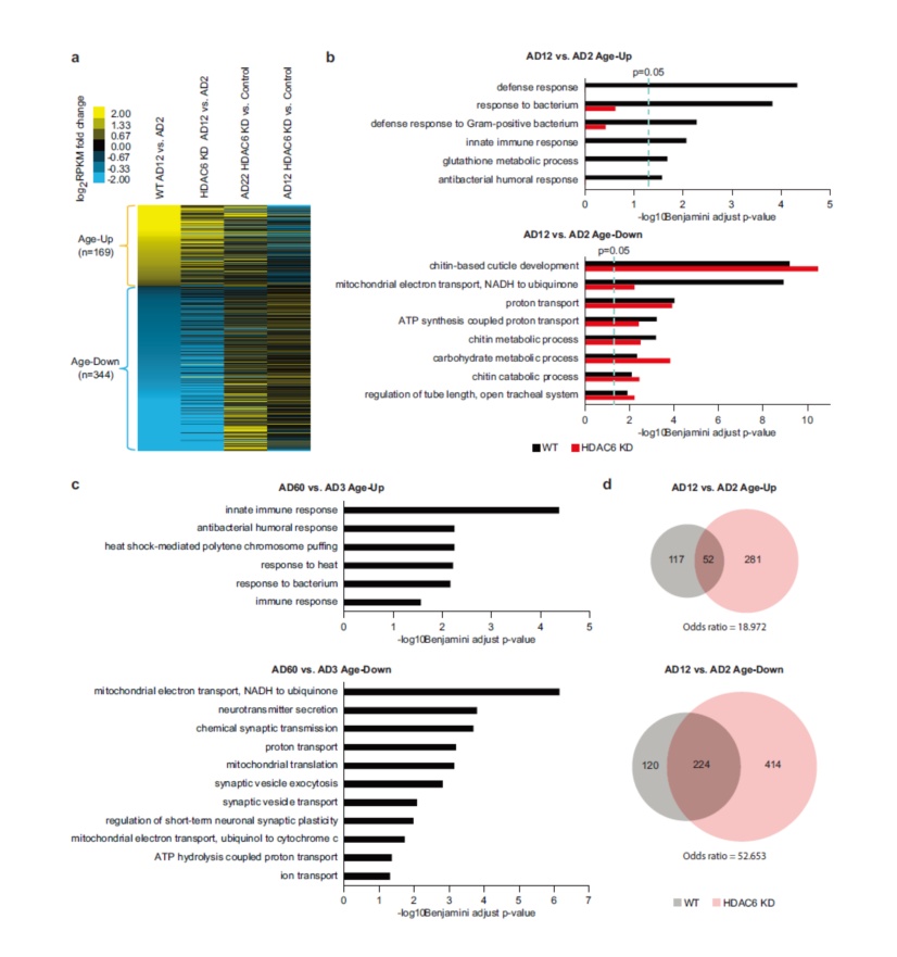 首先,为了检测在衰老过程中与HDAC6作用的靶点,该文研究者收集老龄果蝇的头部进行转录组分析,分别探究对照组果蝇和全身性敲低HDAC6果蝇衰老过程中基因转录变化的情况。在对照果蝇组中,随着衰老,转录上调的基因大多与先天性免疫和炎症反应功能有关。该结果与“机体内炎症反应的强弱是影响机体衰老和寿命的关键因素”的观点一致,随年龄增长,机体会出现促炎反应不断加剧,炎症稳态失衡等现象。而转录下调的基因大多与线粒体功能和几丁质代谢有关(图1a)。在敲低HDAC6的果蝇组中研究者们发现,敲低HDAC6可以显著下调正常果蝇中随衰老上升的先天性免疫和炎症反应基因的转录表达,从而减少果蝇头部的炎症反应(图1a-1b),这与目前HDAC6抑制剂的一些研究结果相同。通过GO富集分析,对照组果蝇和敲低HDAC6果蝇随衰老表达下降的基因类似,但是大多数在对照组果蝇中随衰老表达上升的炎症相关基因,却在HDAC6敲低果蝇中表达下降(图1c-1d)。因此,该文研究者认为HDAC6在果蝇衰老过程中可以正调控免疫相关基因,而敲低HDAC6可以显著抑制先天性免疫和炎症反应基因的过度激活。
