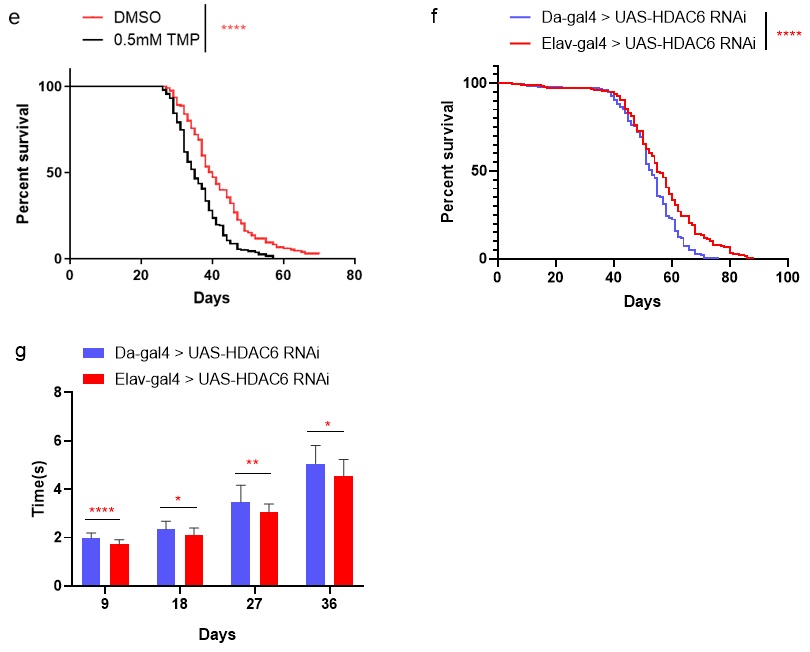 为了进一步证明大脑中特异性敲低HDAC6可以在老龄果蝇中同样发挥作用,该文研究者使用一种化学诱导的Gal80-DD系统,在老龄果蝇大脑中特异性敲低了HDAC6,并检测是否可以延长寿命(图2e)。研究者将UAS-HDAC6Ri果蝇与Elav-gal4, Gal80-DD果蝇杂交,分两组收集后代果蝇用于寿命实验。前25天,两组果蝇都用加有0.5mM TMP的食物饲养,此时果蝇中并未敲低HDAC6;第25天,将一组果蝇改为加入DMSO、不加TMP的食物饲养,从而诱导敲低HDAC6,而另一组果蝇继续饲养加有TMP的食物。实验表明,在老龄果蝇大脑中特异性敲低HDAC6可以显著延长果蝇的寿命。因此,研究者们得出结论,抑制果蝇大脑中的HDAC6可以在果蝇中发挥抗衰老作用。