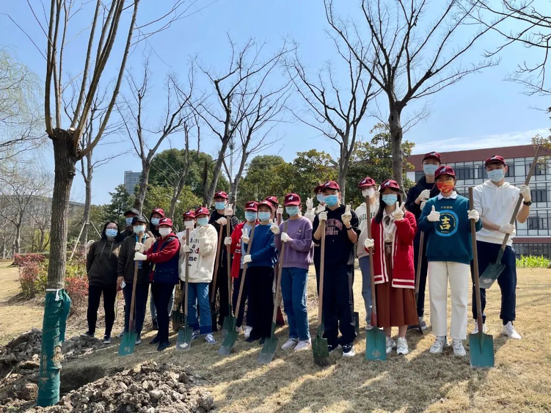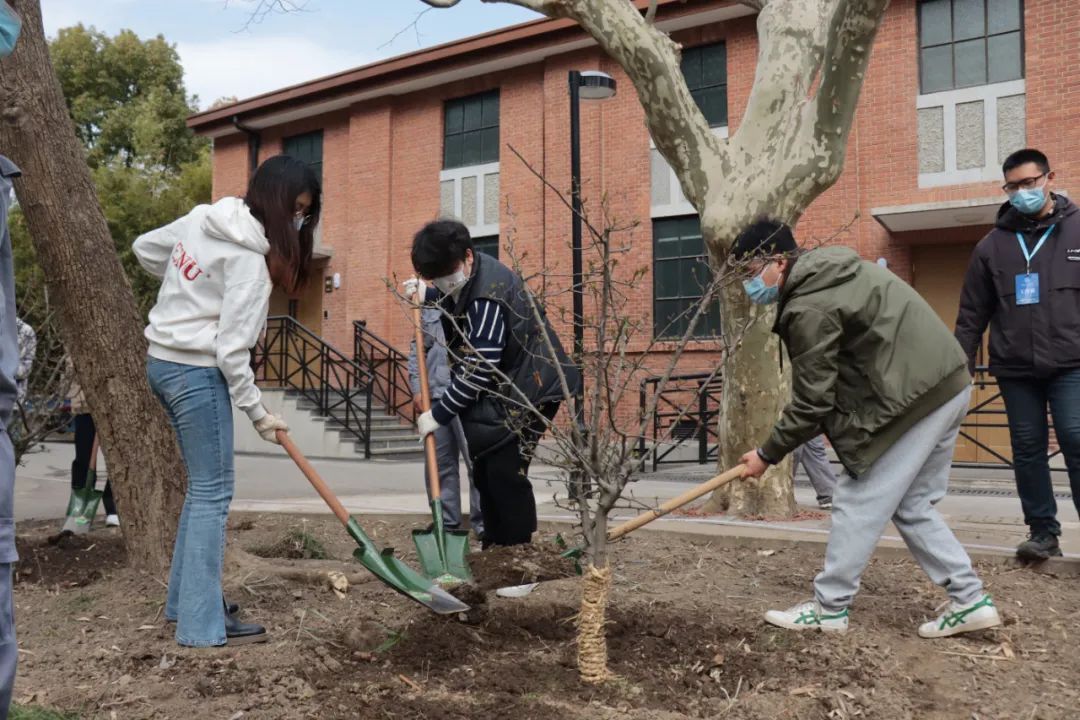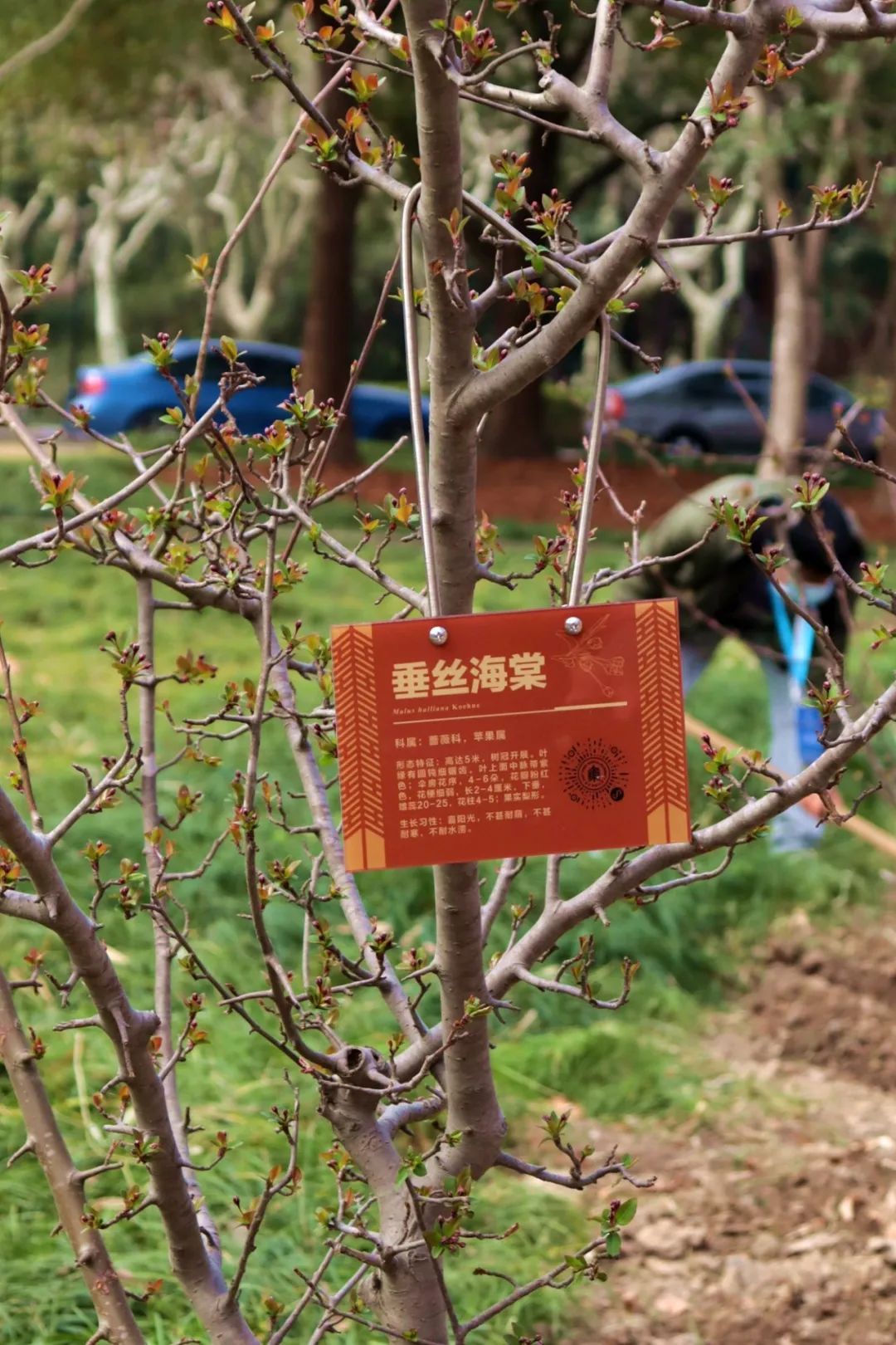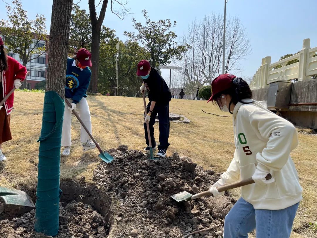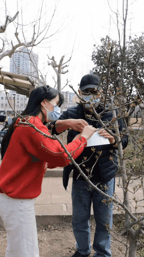 ı 师生为新种下的垂丝海棠佩戴铭牌