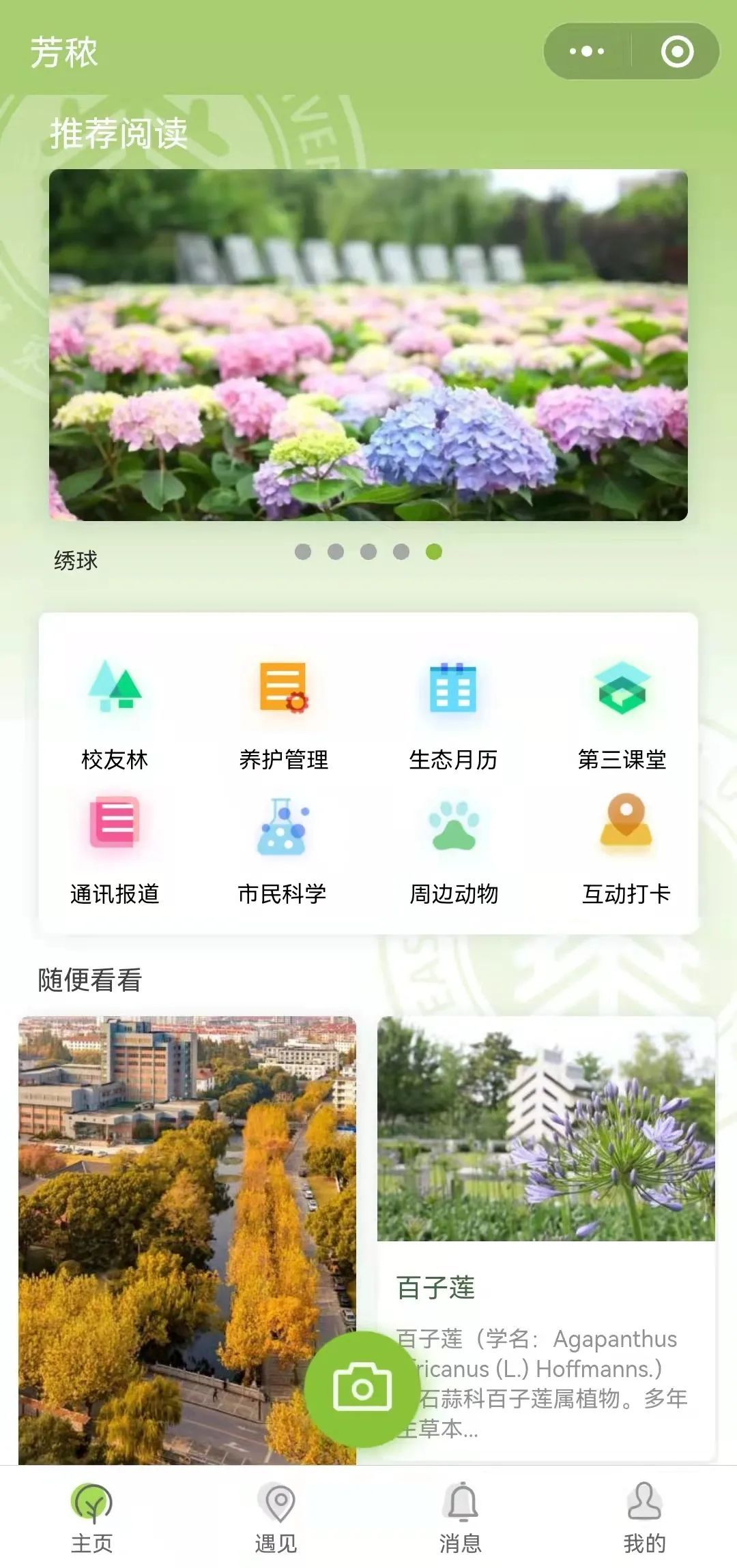 小程序“遇见”版块的生态地图来揭秘。这是华东师大生命科学学院田怀珍副教授带领植物分类学研究生和爱好植物的本科生的调研成果,他们对两校区所有的栽培植物进行了调查、识别和定位,形成了一张生动鲜活的校园常见植物地图。