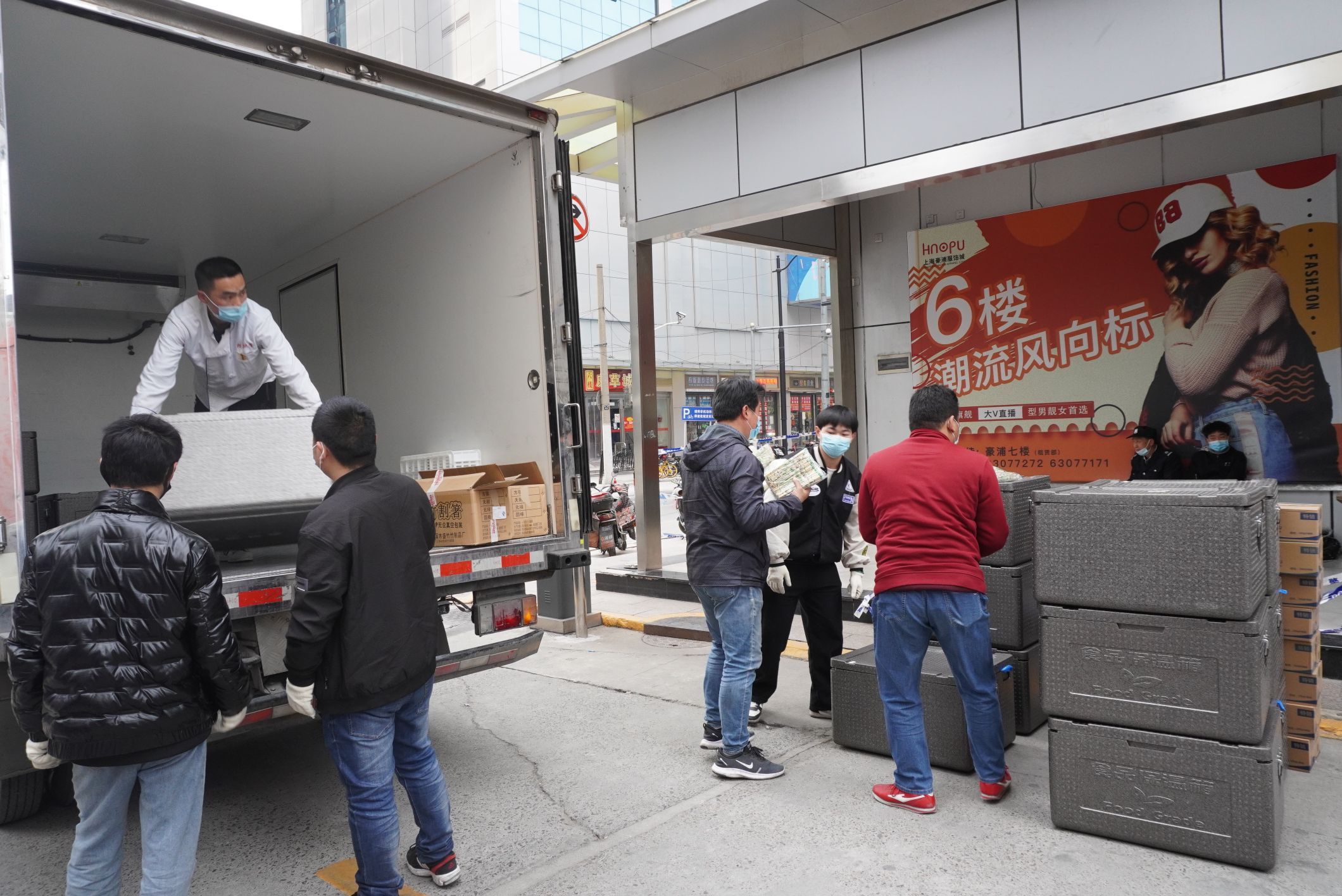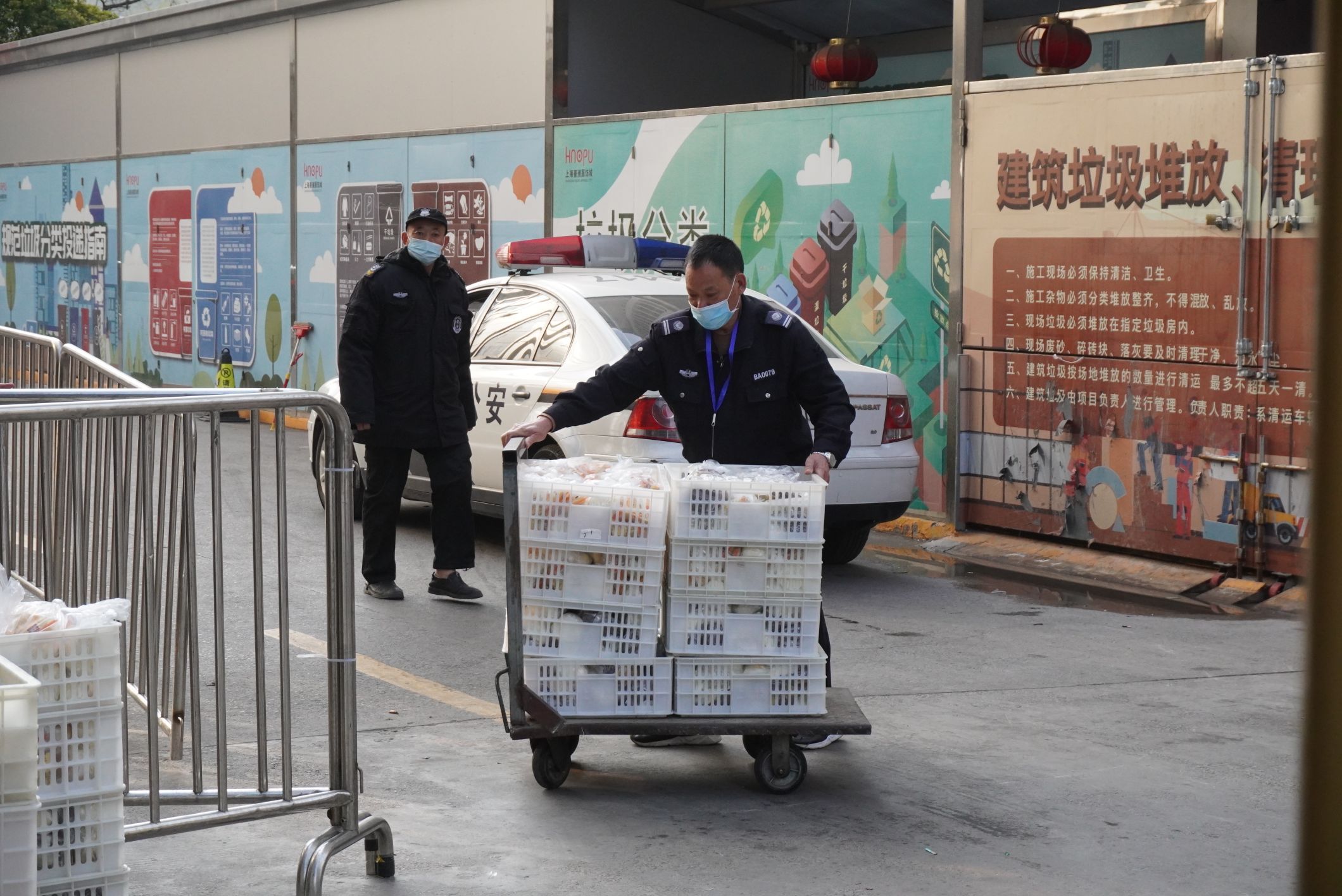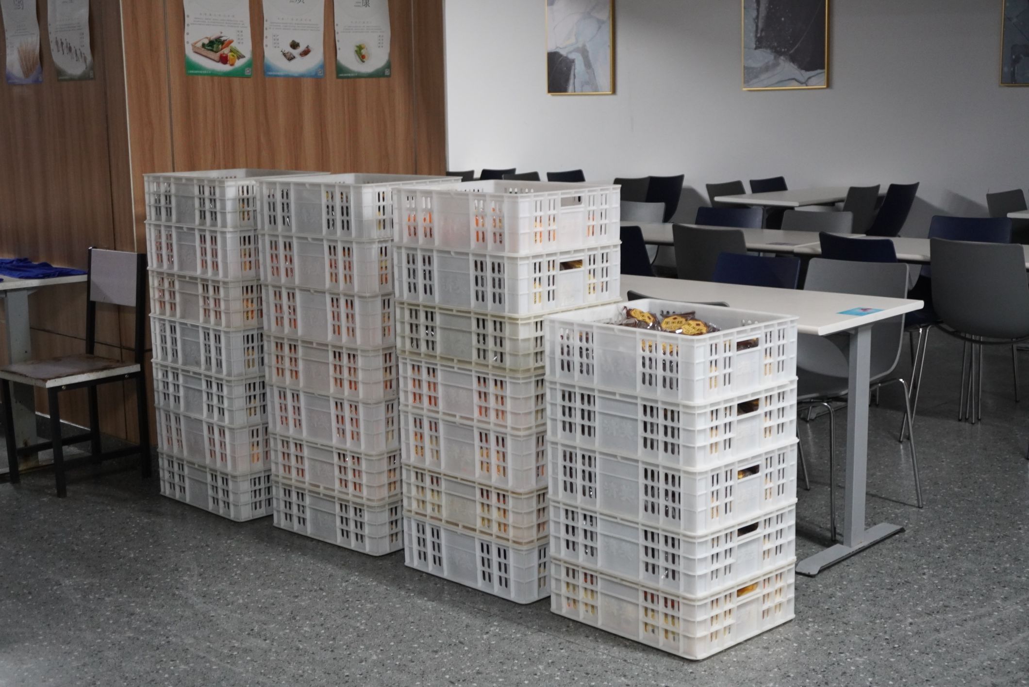 下午4点多,吴劲松与其他5位专门配备在隔离点的公司员工,已早早地等候在配餐指定区域。待专车到达后,大家立即争分夺秒将全部餐品尽快送到指定区域,随后由防疫人员送到隔离点的每一位人员手中。