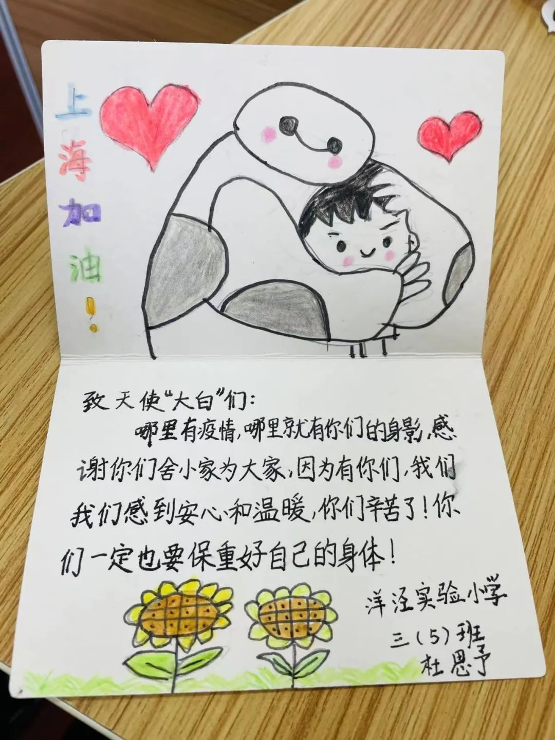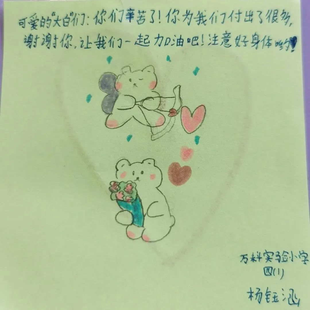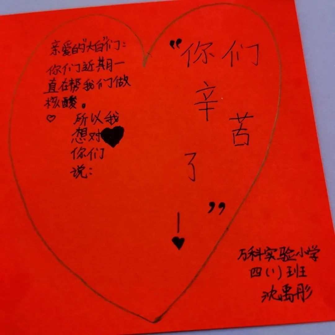 “一直知道‘大白’们工作很辛苦,今天他们来到我们身边,亲眼看到他们顾不上吃饭和休息,给我们全校小朋友做完核酸,又匆忙地离开去下一个地点了。”三年级的杜思予十分感慨。“他们真的像动画片的大白一样,暖暖的,我好想抱抱他们。”她的小小愿望就画在自己的卡片上。