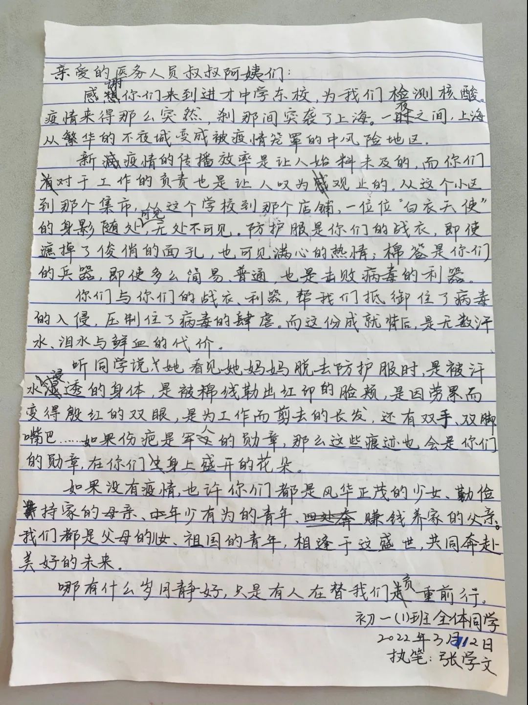 “新疫情的传播速度是让人始料未及的,而你们对于工作的负责也是让人叹为观止的。从这个小区到那个集市,从这个学校到那个街店,一位位‘白衣天使’的身影随处可见,无所不在。”这封由全班同学签名的信字迹娟秀端正,来自进才东校初一(1)班。