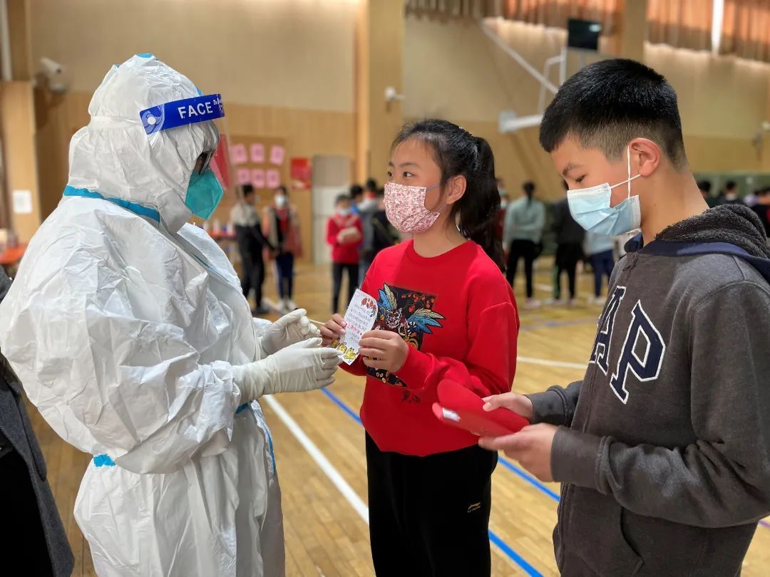 在核酸现场,还有不少孩子看到同学手中的贺卡,也立即向老师要来纸笔写写画画起来。“一些孩子原本是有些紧张的,但‘大白’的精神也鼓舞了他们。”洋泾实验小学倪如玉老师说。