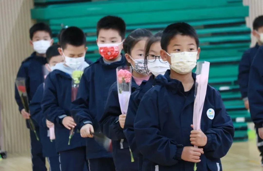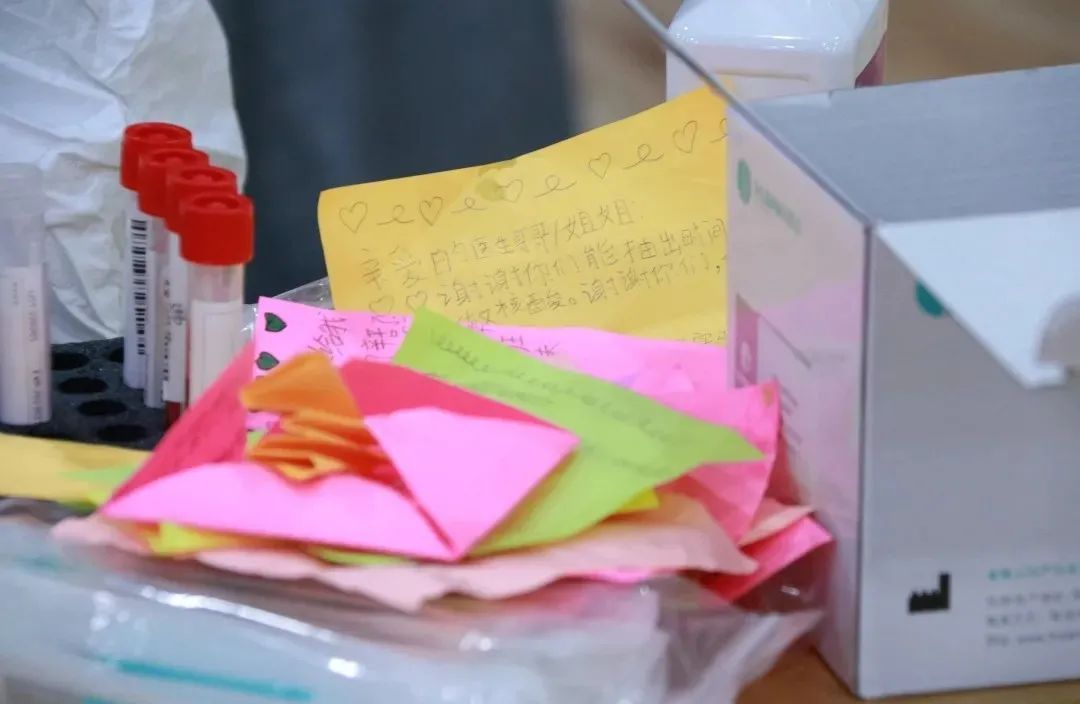 在万科实验小学,可爱的孩子们排着队,把鲜花、卡片、小纸条、千纸鹤送给“大白”们,感谢他们放弃休息时间,为了守护人们健康而马不停蹄地工作。“大白”们埋头扫码检测,一年级的孩子们唱起了《感恩的心》和《听我说谢谢你》,稚嫩的声音表达孩子们最真挚的心。