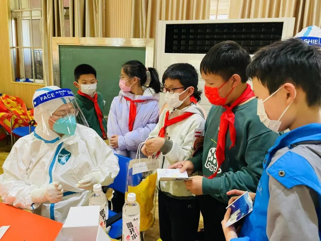 在洋泾实验小学现场,党团员老师们分工协作,协助维持秩序,安排学生分组检测,体育老师负责整队。学生们十人一组,有的班级人数不够,需要整个年级协调核定教师、学生检测人数。大约一个半小时,一千多个学生和老师便检测完毕。