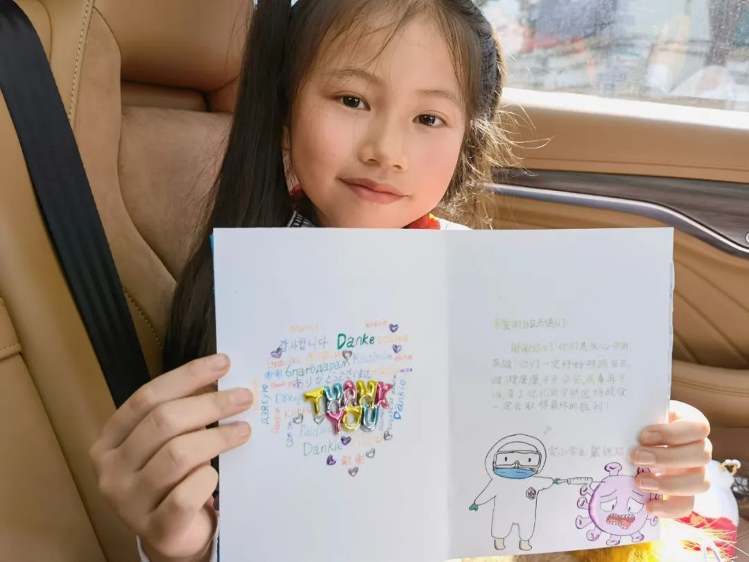手持针筒如宝剑,吓得病毒瑟瑟发抖。在三年级的戴楒琂眼中,白衣天使是真正的英雄,一声“谢谢”不足以表达,在妈妈的帮助下,她查到十几种语言中“谢谢”的写法,组合成漂亮的爱心形状,表达自己对白衣天使的感谢。她的妈妈告诉记者,女儿一直喜欢画画,前一天听到老师提议向“大白”们表达感谢,就用自己最擅长的方式精心准备起来。