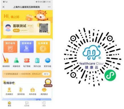 第五步:核酸报告查询,通过上海市儿童医院互联网医院首页进入【报告查询】查看或进入健康云小程序点击结果查询查看报告。报告结果出来后可至 24 小时自助机处刷卡或二维码打印报告。
