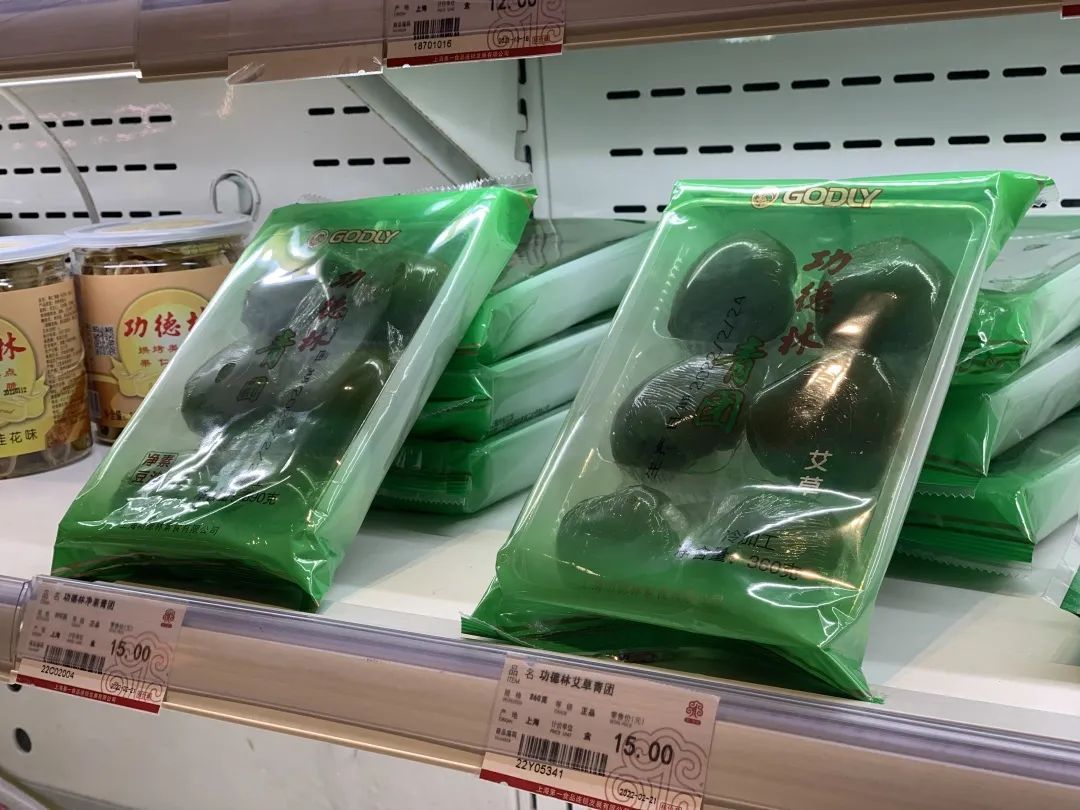 在商店二楼,袋装青团也被摆上了柜台。比如乔家栅,当前主要售卖豆沙和咸蛋黄肉松两种口味,而功德林,则主销净素豆沙口味和艾草口味。值得注意的是,功德林的这两款均含豆沙馅,只是青团皮不同。