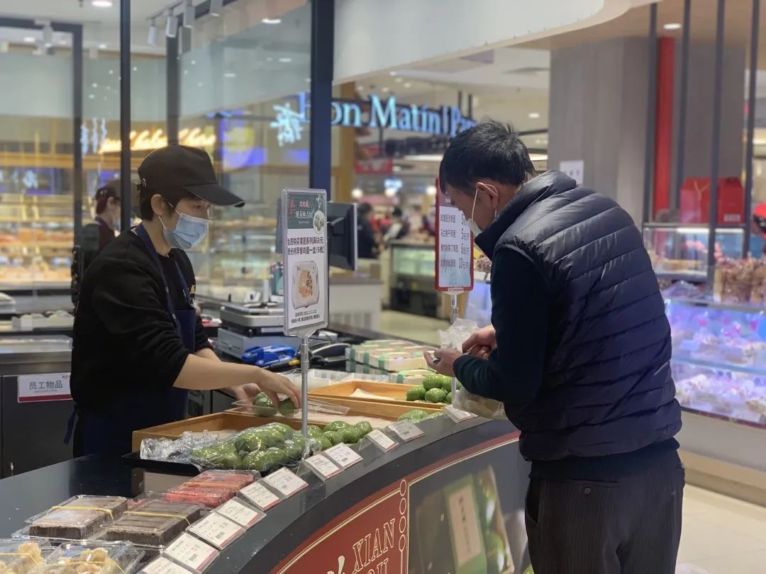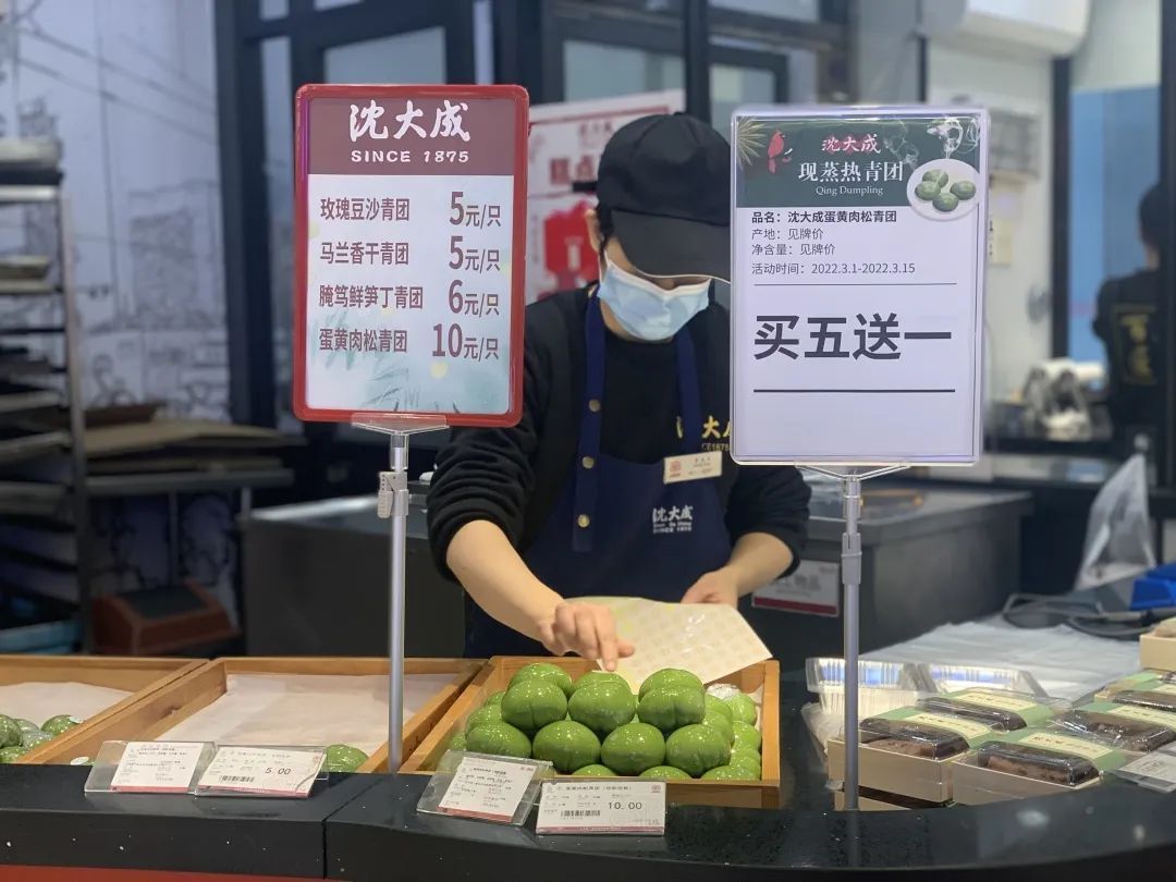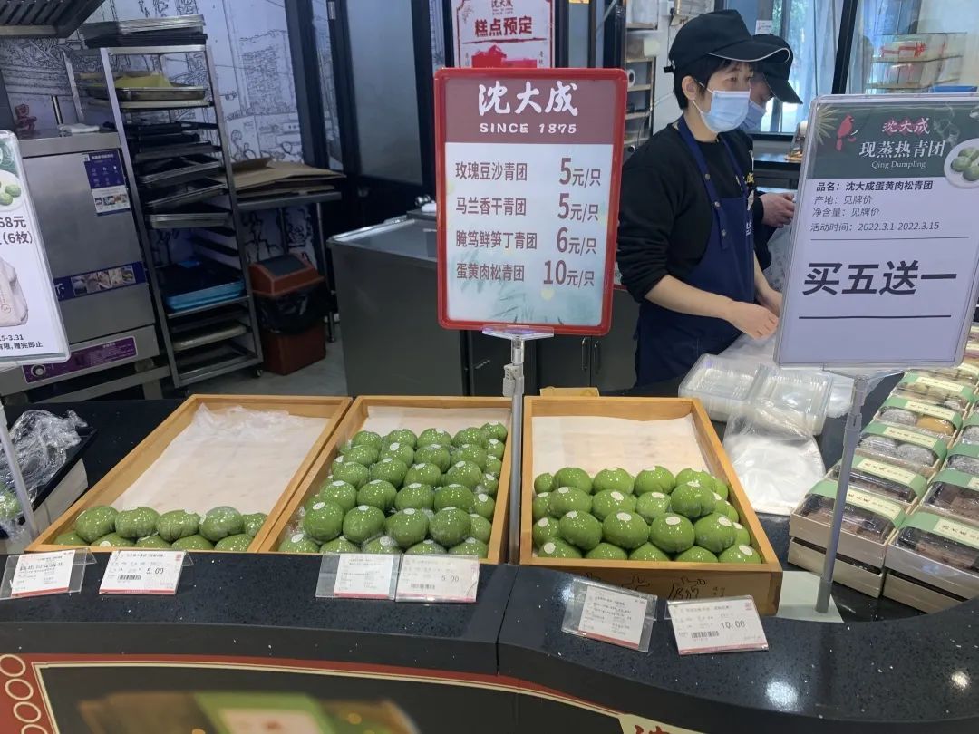 下午两点,位于五角场商圈的第一食品商店门口的沈大成,现做青团令人垂涎。后台的工作人员捏压揉搓,飞快制作出一只只新鲜青团;柜台前的店员则忙着给成品包装好,贴上一个个代表口味的贴纸。