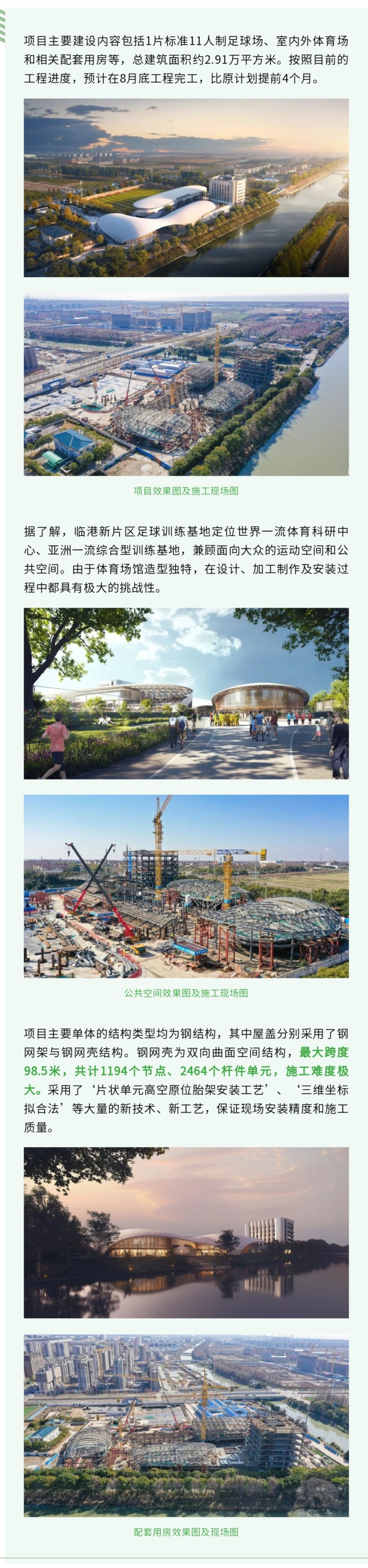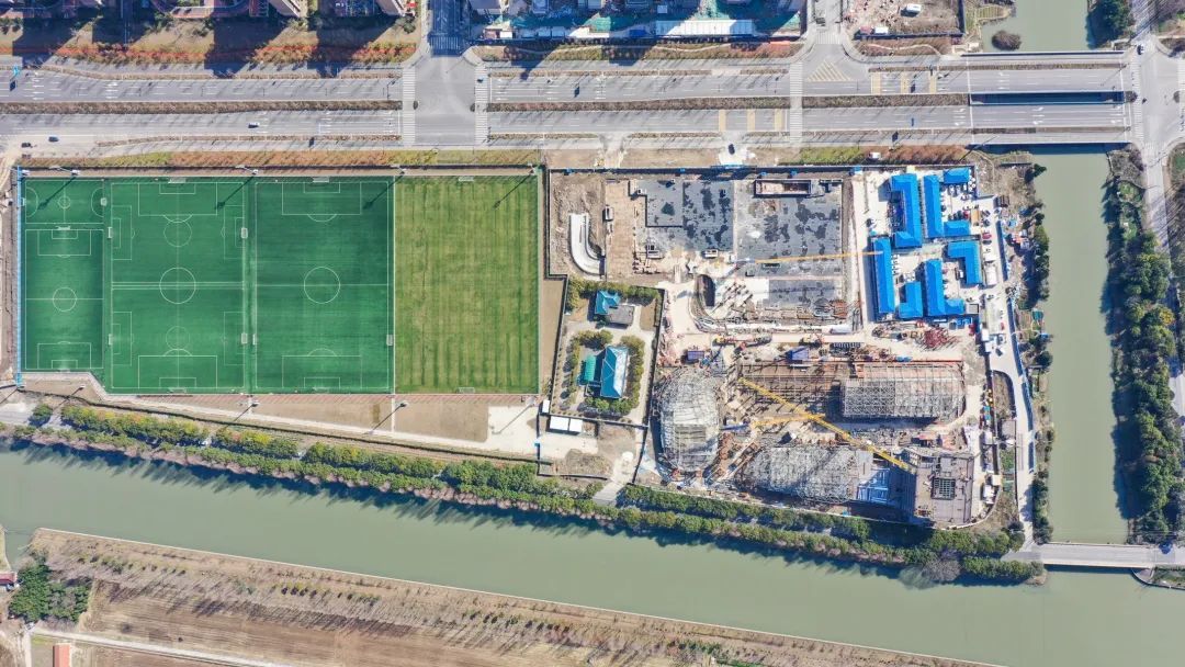 上海临港新片区足球训练基地紧临海湾镇蓝湾国际社区,为中港以东、承贤路以西、人民塘以北、友谊河以南的三角形区域,总用地面积约7.7万平方米。目前,项目已进入屋盖、砌筑及机电工程施工阶段,预计在8月底迎来完工,9月底完成竣工备案。