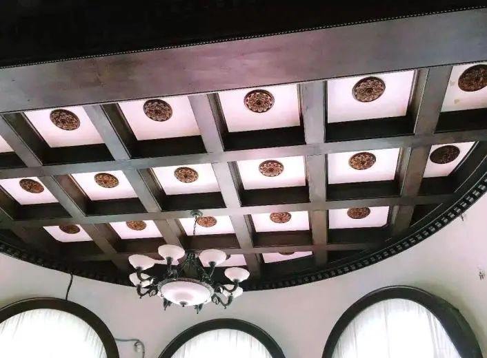 西厅装饰部分吸收了宫廷式的屋顶风格,四角采用宝瓶变形而来的花篮装饰,简洁而又不失华丽。东厅陈列室采用中式藻井风格,透着古色古香。