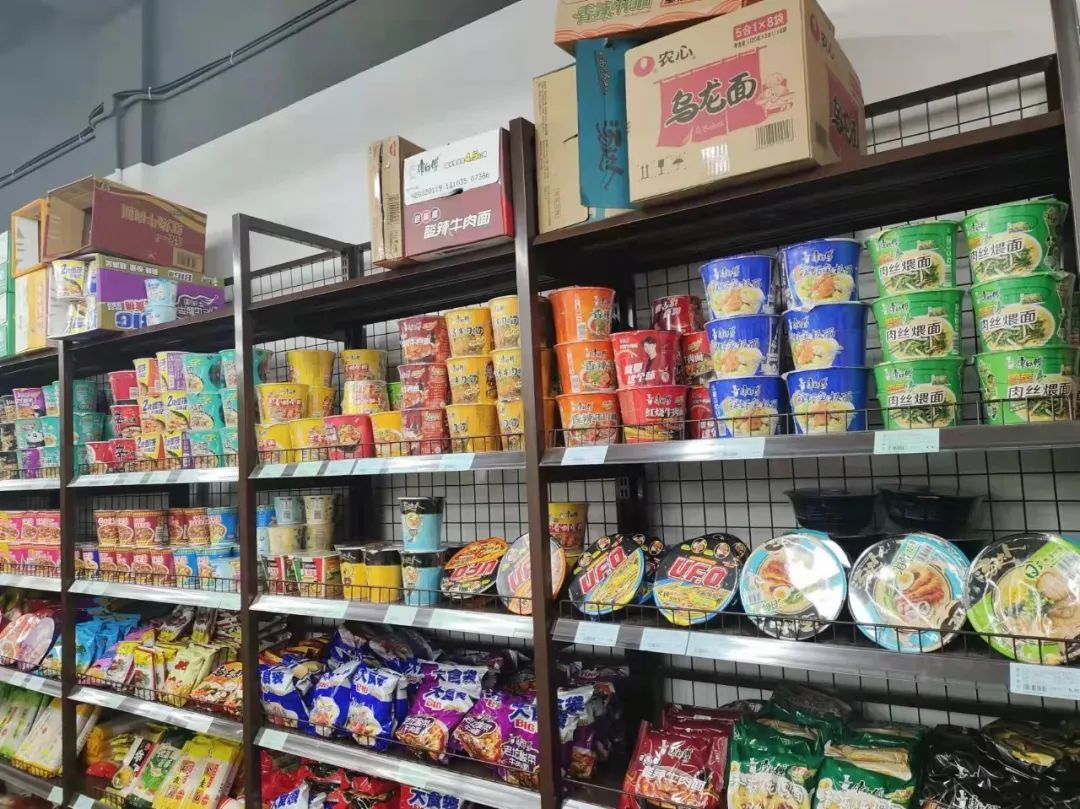 超市内的货架上满满当当,米面粮油等副食品货源充足,整齐地摆放在专设区域,不少市民在货架前挑选着心仪的产品。
