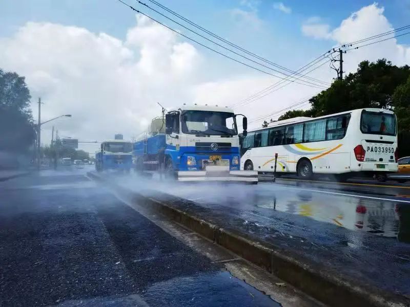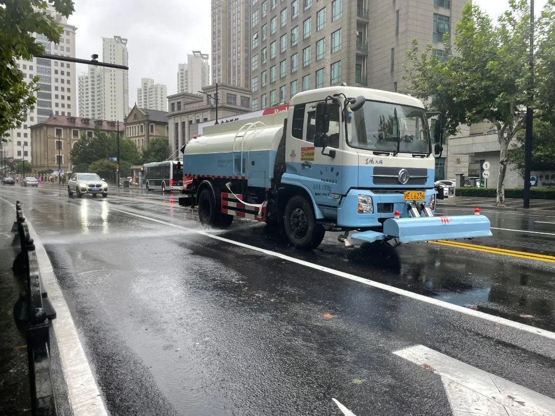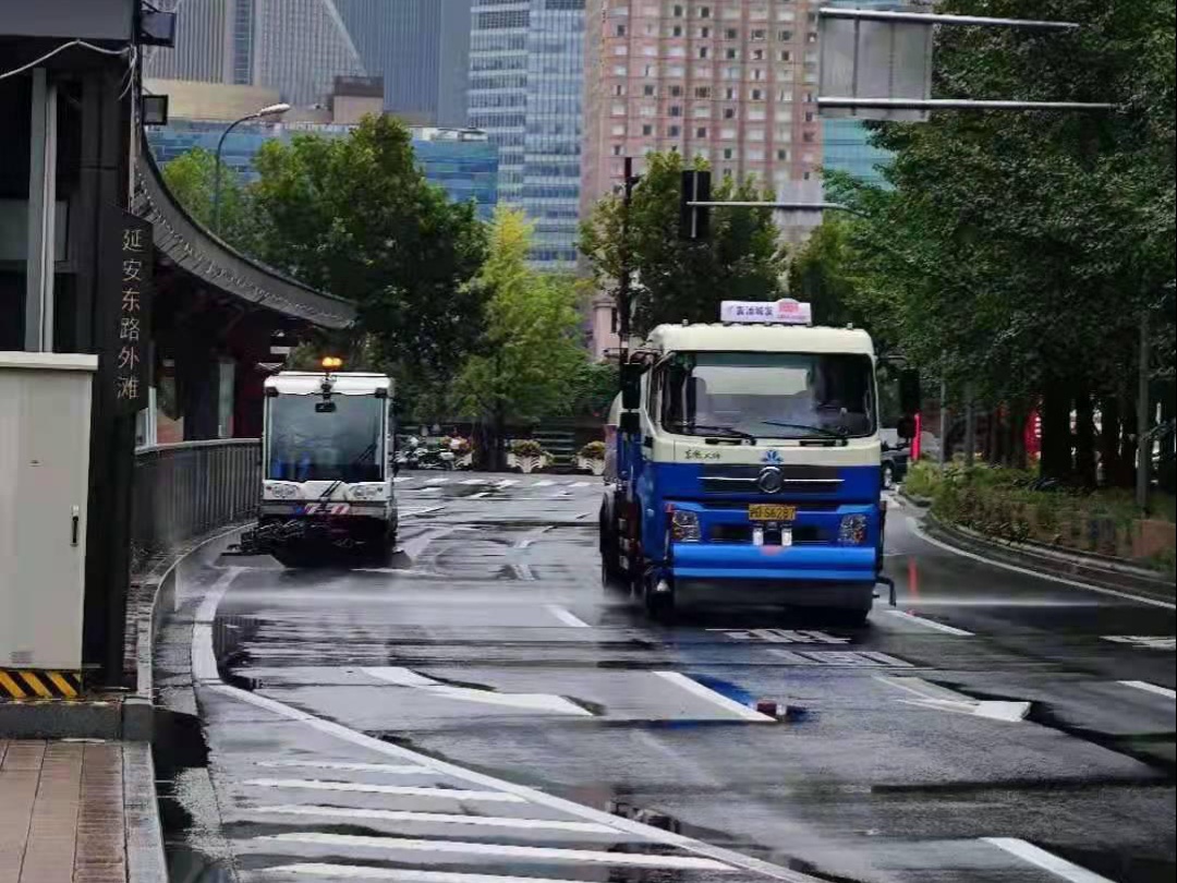 雨天冲洗:洒水车进行的是道路“冲洗”作业,将与地面粘连的垃圾、落叶、污泥、污迹等冲洗干净,达到道路环境干净整洁的保洁标准。