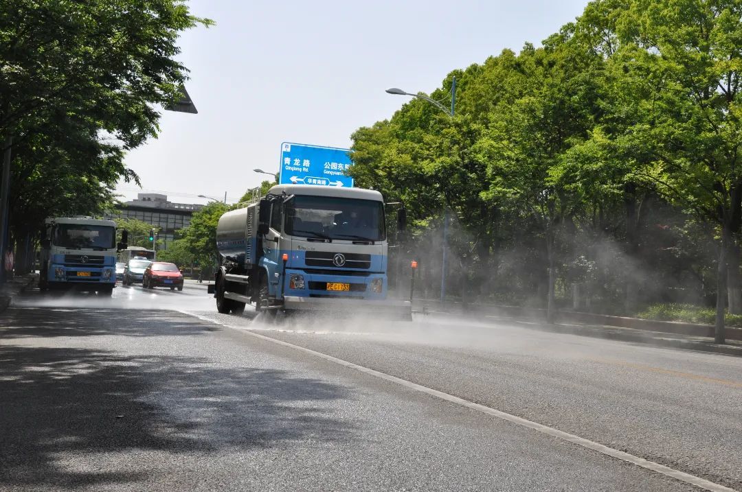 晴天洒水:洒水车进行道路“洒水”作业,主要起到降尘、降温、增加空气湿度、保护路面的作用。