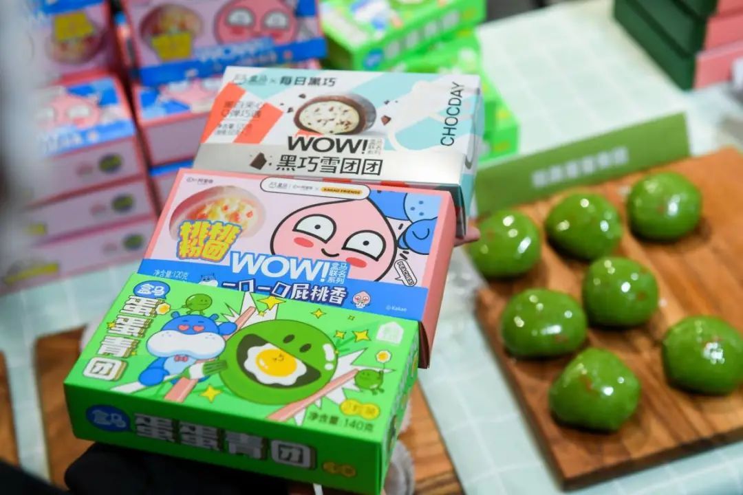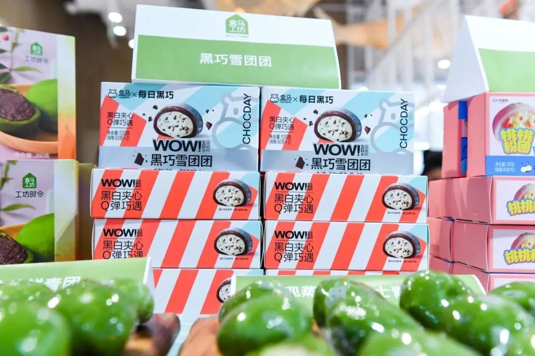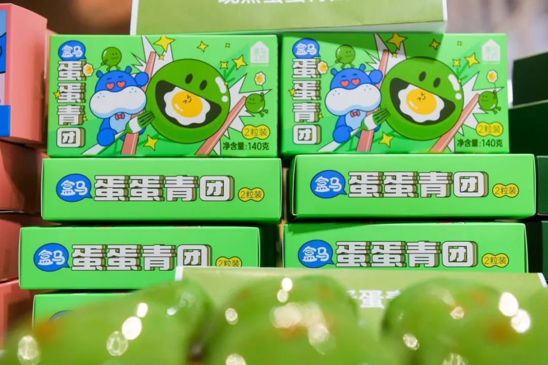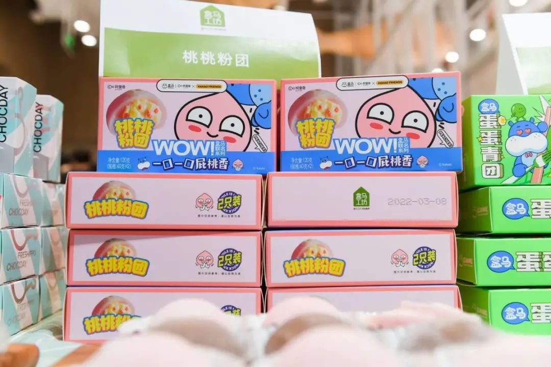 除了上述现蒸青团外,今年盒马还与阿里鱼Xkakao friends、每日黑巧、花知晓联名,分别推出了桃桃粉团、黑巧雪团团、腮红“团子”等“彩团”。
