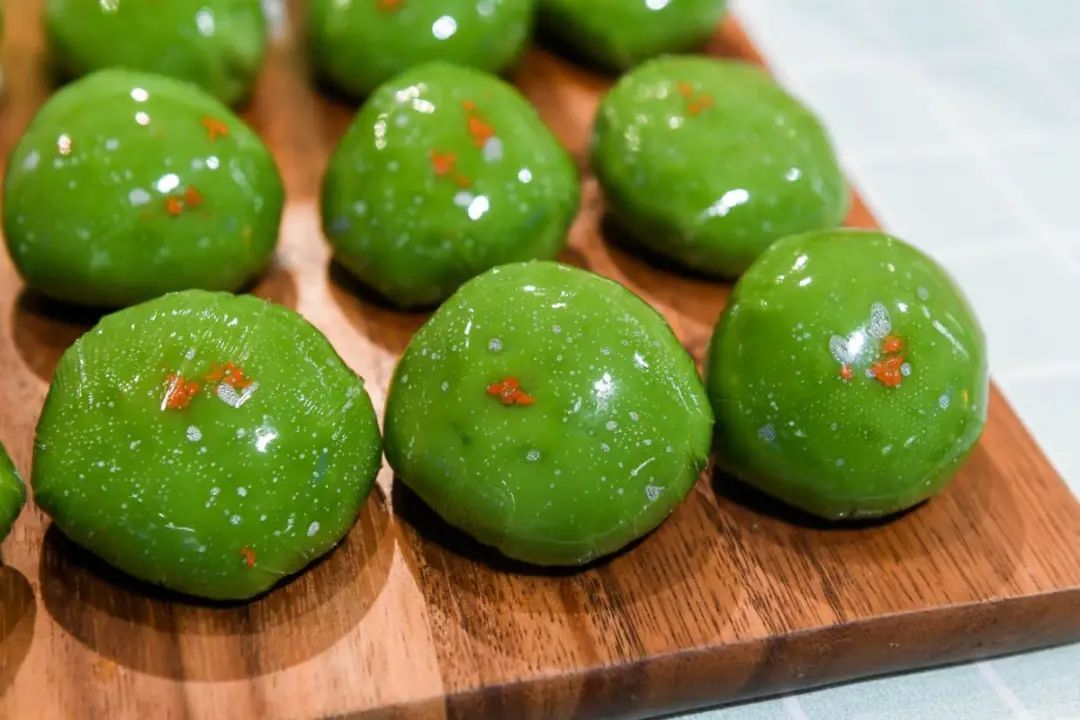 蛋蛋青团的创意来源于上海很多西餐厅中常见的水波蛋。蛋蛋青团咬开后与水波蛋相似度很高,除了蛋黄香以及表皮的糯米香外,还融入了酒酿和水麻薯,增添青团风味的同时,降低青团本身的甜腻。