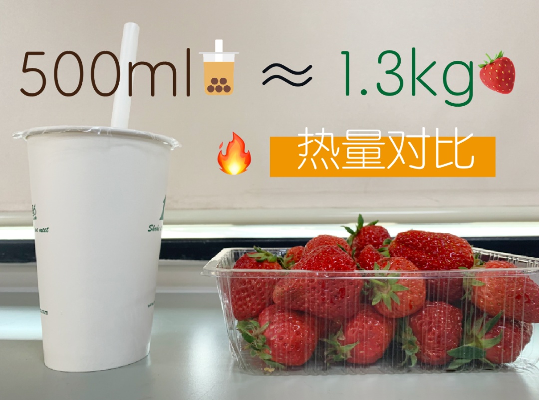 如果这个数据还不是很直观,那我们做一下热量对比:一杯500ml的全糖珍珠奶茶≈1.3 kg草莓。