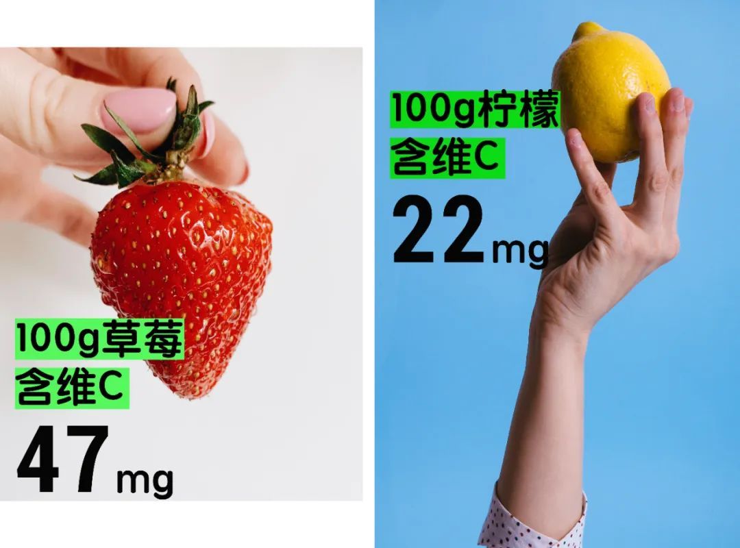 除此之外,草莓的维生素C的含量在水果界也是数一数二的。人们通常认为柠檬和橙子的维生素C含量很高,殊不知每100g的草莓中维生素C的含量有47mg,而同等重量的柠檬只有22mg。