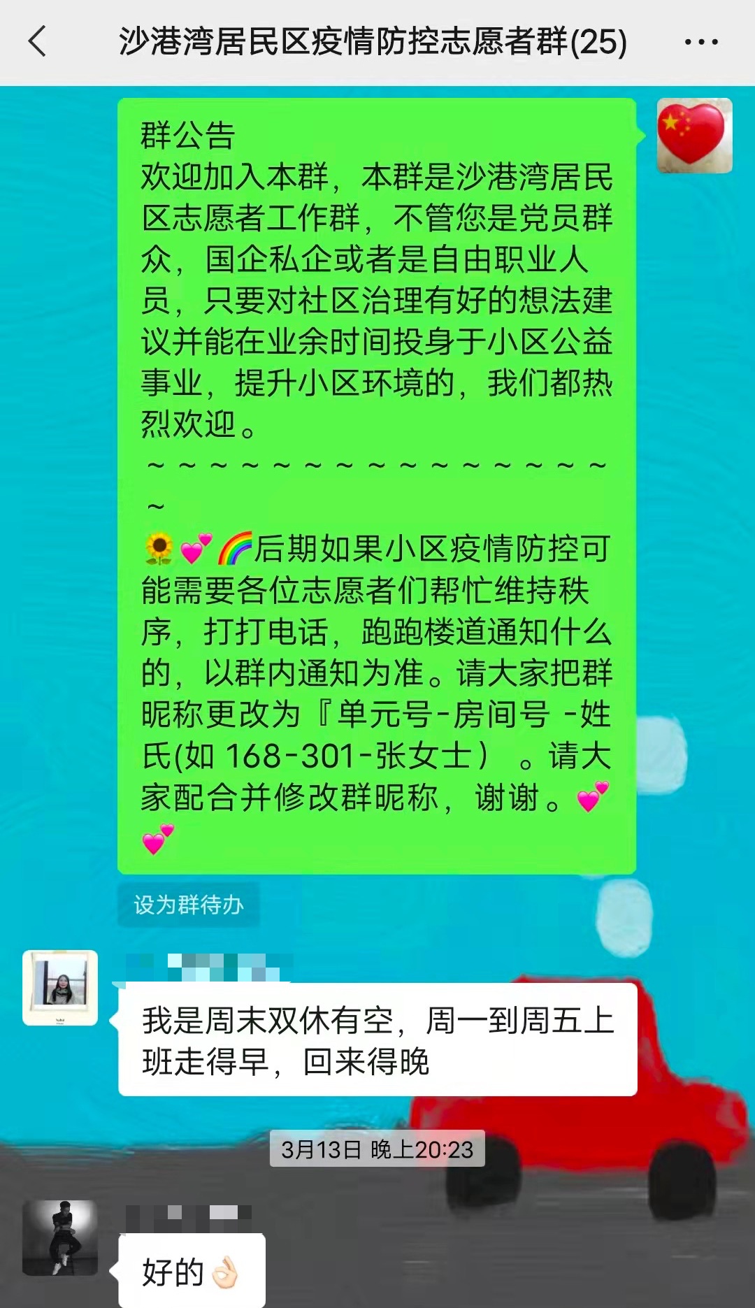 13日晚8点,沙港湾居委接到通知,需要在第二天早上7点开始全员核酸检测。本次任务时间紧急、工作量大,然而可以调配的人手却十分有限。此时,当天的值班长、沙港湾居委副主任汤春欢想到了曾向他表示过有参加志愿服务意向的居民阮先生、尤先生。