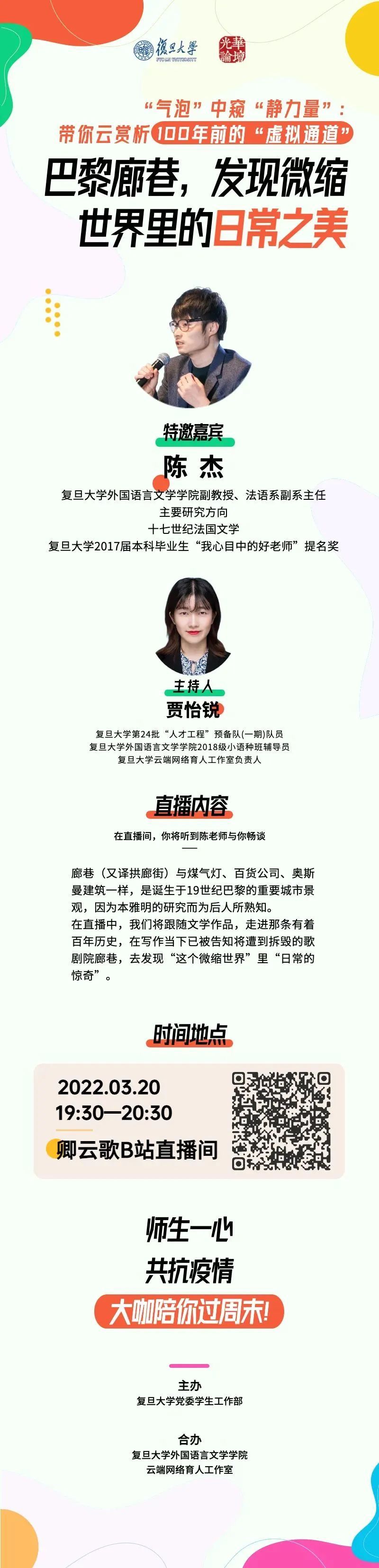 邀请学院分党委委员、法语语言文学系副教授陈杰来到“复旦卿云歌”B站直播间,线上与学生交流。