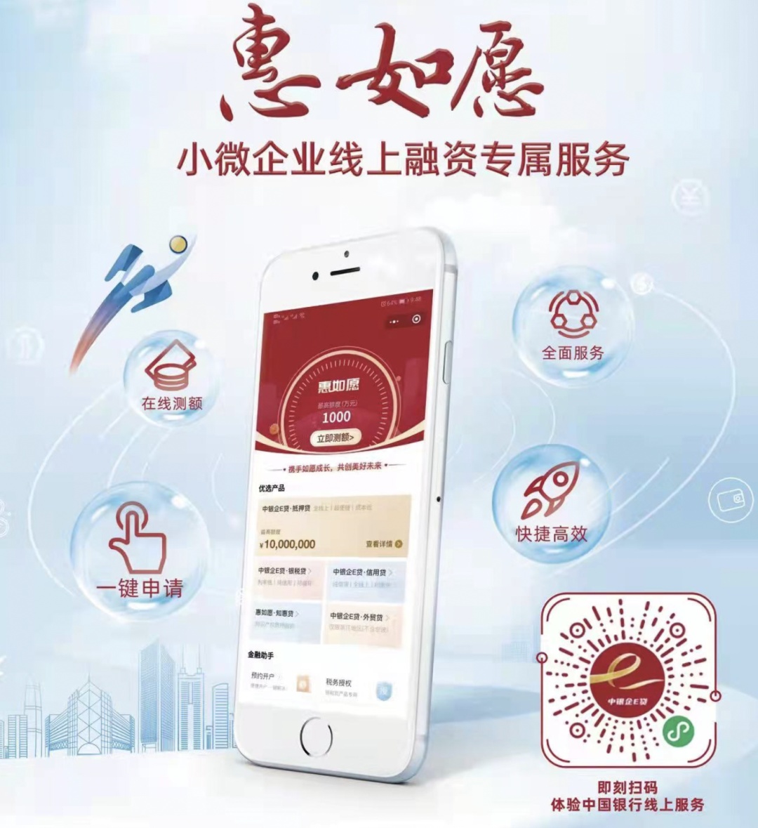 “惠如愿”:向重点中小微企业提供针对性普惠金融服务。包括小微企业贷款(惠如愿•抵押贷、惠如愿•银税贷、惠如愿•信用贷)和个人贷款(惠如愿•个人经营贷)等,最高额度1000万元。