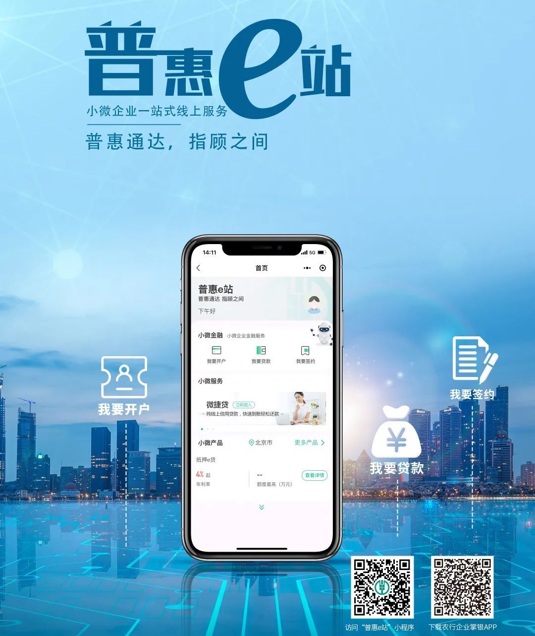 “普惠e站”:农行通过运用互联网、大数据、人工智能等新技术,为小微企业客户提供一站式线上综合金融服务场所,包括“我要开户、我要贷款、我要签约”三大核心功能。小微企业用户可及时获取产品信息,享受7*24小时的开户预填、信用评测、信贷办理、产品签约、智能客服等多项便捷服务。