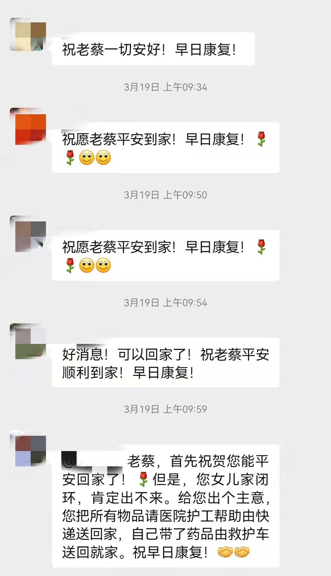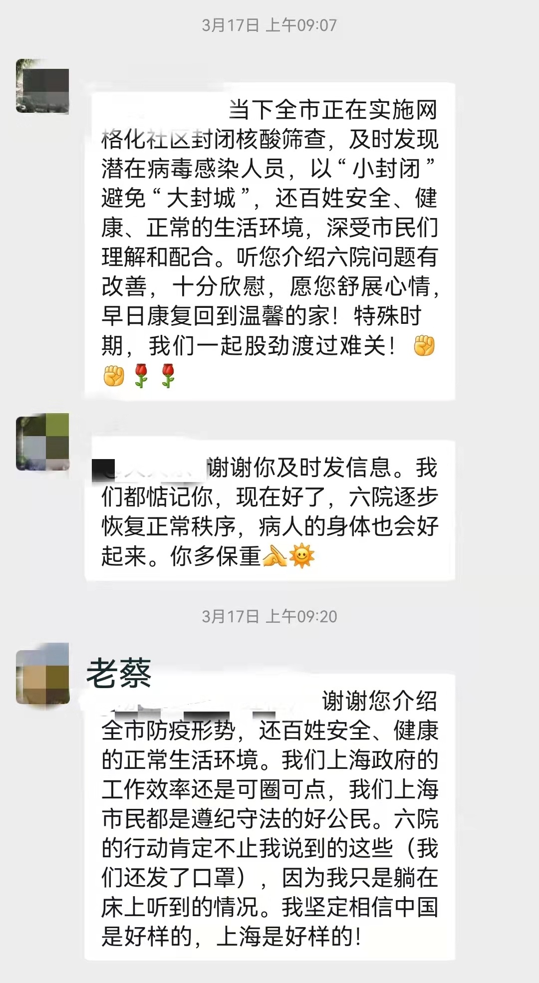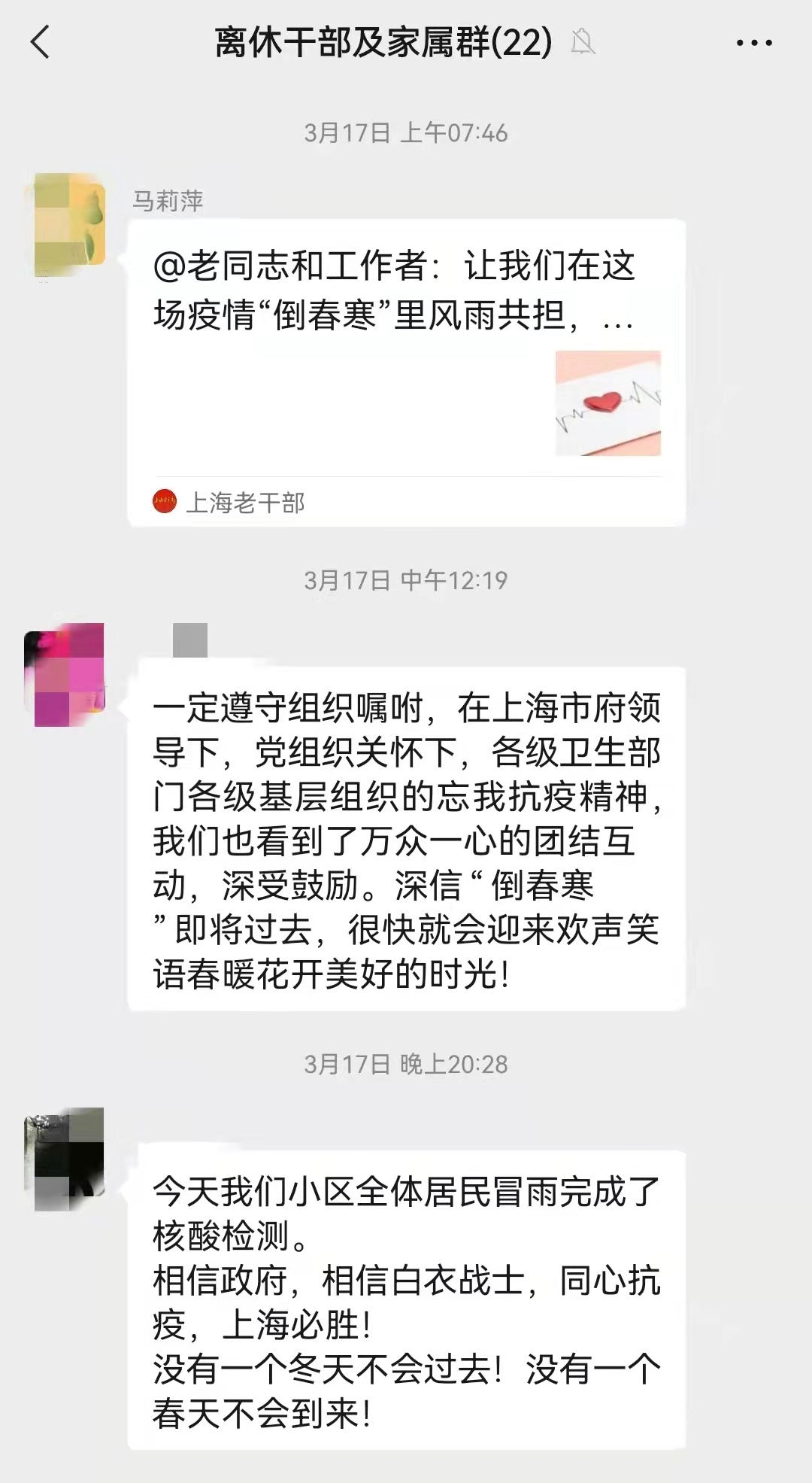 3月9日,委老干部活动室在对老同志情况进行又一轮排摸时,得知一老同志正在上海市第六人民医院封闭管控中,虽然已经得到安置,但是由于其肺部旧疾平时就需要24小时接氧,突如其来的变化难免使他心中产生恐慌和焦躁,住院老同志的身体和心理状况时刻牵动着大家的心。委老干部活动室主任马莉萍通过电话、微信,积极对老蔡进行情绪安抚、心理疏导,给予共情理解、鼓励支持。老干部们也守望相助,通过微信群传递温暖。一句句暖心的话语、一份份温馨的提示,都使这位老同志每时每刻感受着大家庭的温暖。3月19日,这位老同志平安出院,情绪积极平稳,并表示对上海战胜疫情充满信心。