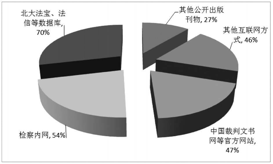 在对“选择案例数据库检索案例的渠道”(多选)调查中发现,70%被调查对象表示选择“北大法宝、法信等数据库”;54%被调查对象表示选择“检察内网”;53%被调查对象表示选择检答网;47%被调查对象表示选择“中国裁判文书网等官方网站”;46%被调查对象表示选择“其他互联网方式”;27%被调查对象表示选择“其他公开出版刊物”。(见图表2:选择案例数据库检索案例的渠道)由此可知实践中,干警在办案过程中,需要查找已经发布的指导性案例、典型案例时,查询检索渠道众多,每个渠道收集的案例也并不全。且在内外网存在隔离墙的情况下,查找时有诸多不便,耗时耗力。