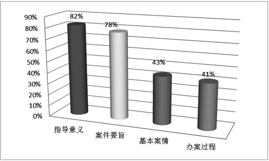 根据《最高人民法院关于案例指导工作的规定》和《最高人民检察院关于案例指导工作的规定》,各级法院、各级检察院对于与发布的指导性案例相类似案件,应当参照适用。但是对于何为类似,并无明确规定。导致实践中,对何为类似的理解众说纷纭,往往导致查找、比对出“类似”率畸高或畸低,影响案例指导作用的发挥。如在对“应以何种标准来判断案件与拟参照案例是否相似”(多选)的调查中发现,89%调查对象认为“争议焦点相似”;78%调查对象认为“法律适用相似”;65%调查对象认为“基本事实相似”;57%调查对象认为“价值判断相似”;24%调查对象认为“案由相同”;8%调查对象认为“凭借主观经验判断”;1%调查对象认为“其他”。(见图表3:应以何种标准来判断案件与拟参照案例是否相似)此外,对于类案参照适用时,具体应该参照适用案例的哪一部分,两高的规定也不明确,实践运用中也存在困惑。如,在对“案例的参照适用内容”(多选)的调查中发现,82%的调查对象表示应参照“指导意义”;78%的调查对象表示应参照“案件要旨”;43%的调查对象表示应参照“基本案情”;41%的调查对象表示应参照“办案过程”。(见图表4:案例的参照适用内容)