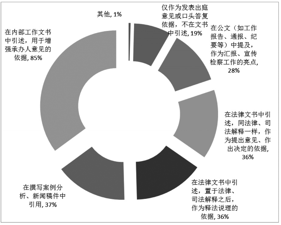 根据《〈最高人民法院关于案例指导工作的规定〉实施细则》第10条和《最高人民检察院关于案例指导工作的规定》第15条规定,类案办理可以参照适用指导性案例,但参照适用应体现在何种法律文书中并无明确。《〈最高人民法院关于案例指导工作的规定〉实施细则》第10条规定“应当将指导性案例作为裁判理由引述”,可否理解为法官适用应体现在判决书或裁定文书中。在《最高人民检察院关于案例指导工作的规定》第15条规定“…可以引述相关指导性案例进行释法说理,但不得代替法律或者司法解释作为案件处理决定的直接依据”可否理解为检察官对两高指导性案例的参照适用应体现在审查报告等内部文书或是公诉意见书等文书中。在对“案例的参照适用方式”(多选)的调查中发现,85%被调查对象认为“在内部工作文书中引述,用于增强承办人意见的依据”;37%被调查对象认为“在撰写案例分析、新闻稿件中引用”;36%被调查对象认为“在法律文书中引述,置于法律、司法解释之后,作为释法说理的依据”;36%被调查对象认为应“在法律文书中引述,同法律、司法解释一样,作为提出意见、作出决定的依据”;28%被调查对象认为“在公文(如工作报告、通报、纪要等)中提及,作为汇报、宣传检察工作的亮点”;占比19%被调查对象认为“仅作为发表出庭意见或口头答复依据,不在文书中引述”;1%被调查对象认为“其他”。(见图表5:案例的参照适用方式)