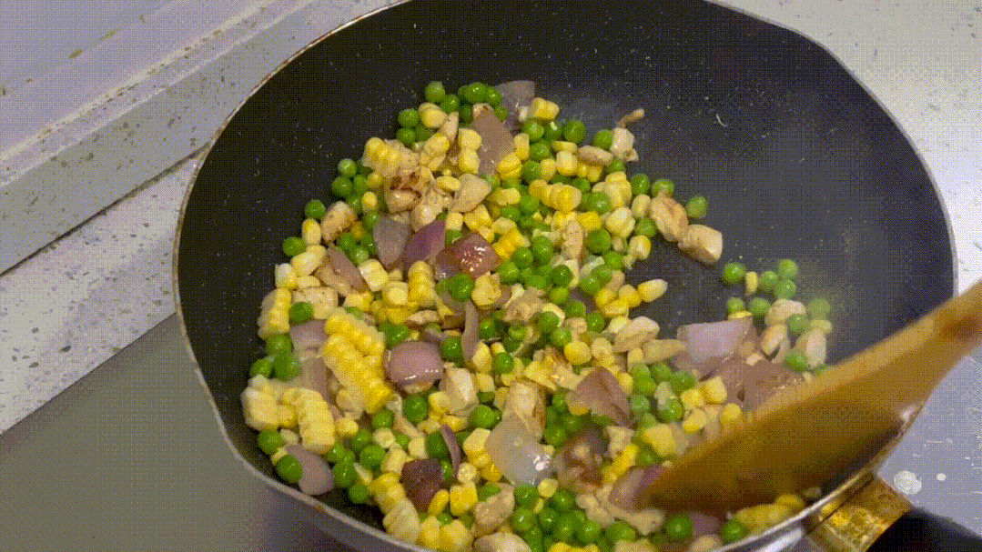 倒入玉米、豌豆煸炒。