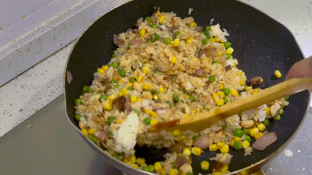 炒至金黄时,倒入菠萝、鸡蛋,翻炒均匀,热腾腾的家常版菠萝炒饭就出锅啦~