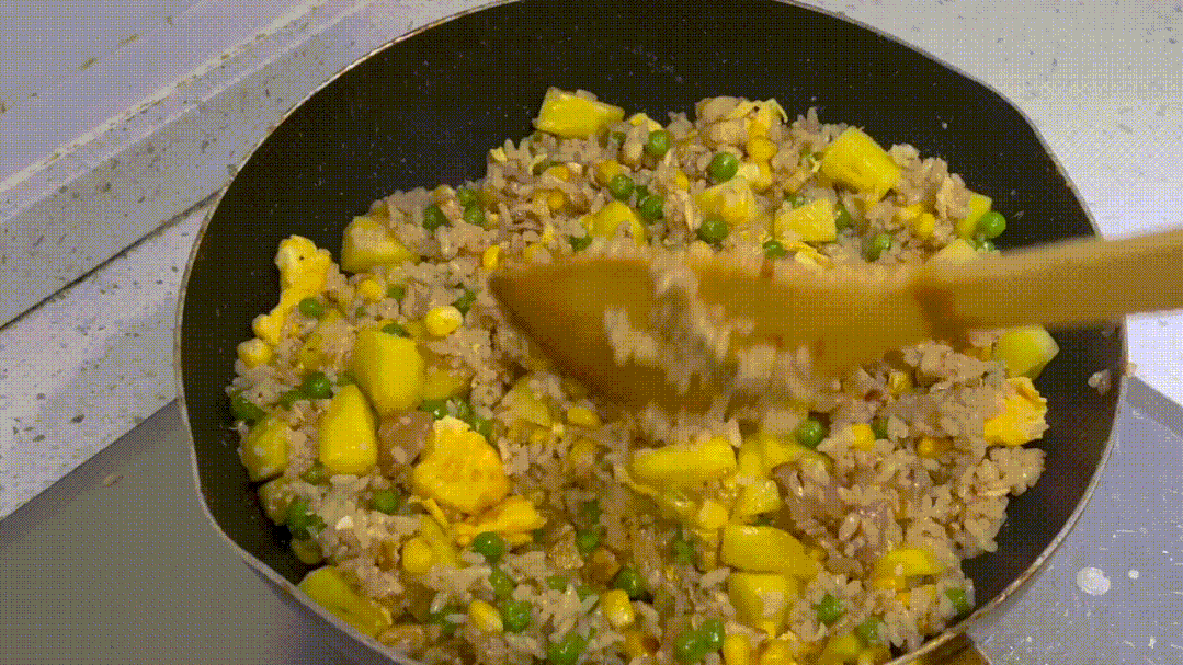 待玉米、豌豆炒熟后加入熟米饭,用盐、生抽、老抽、蚝油调味